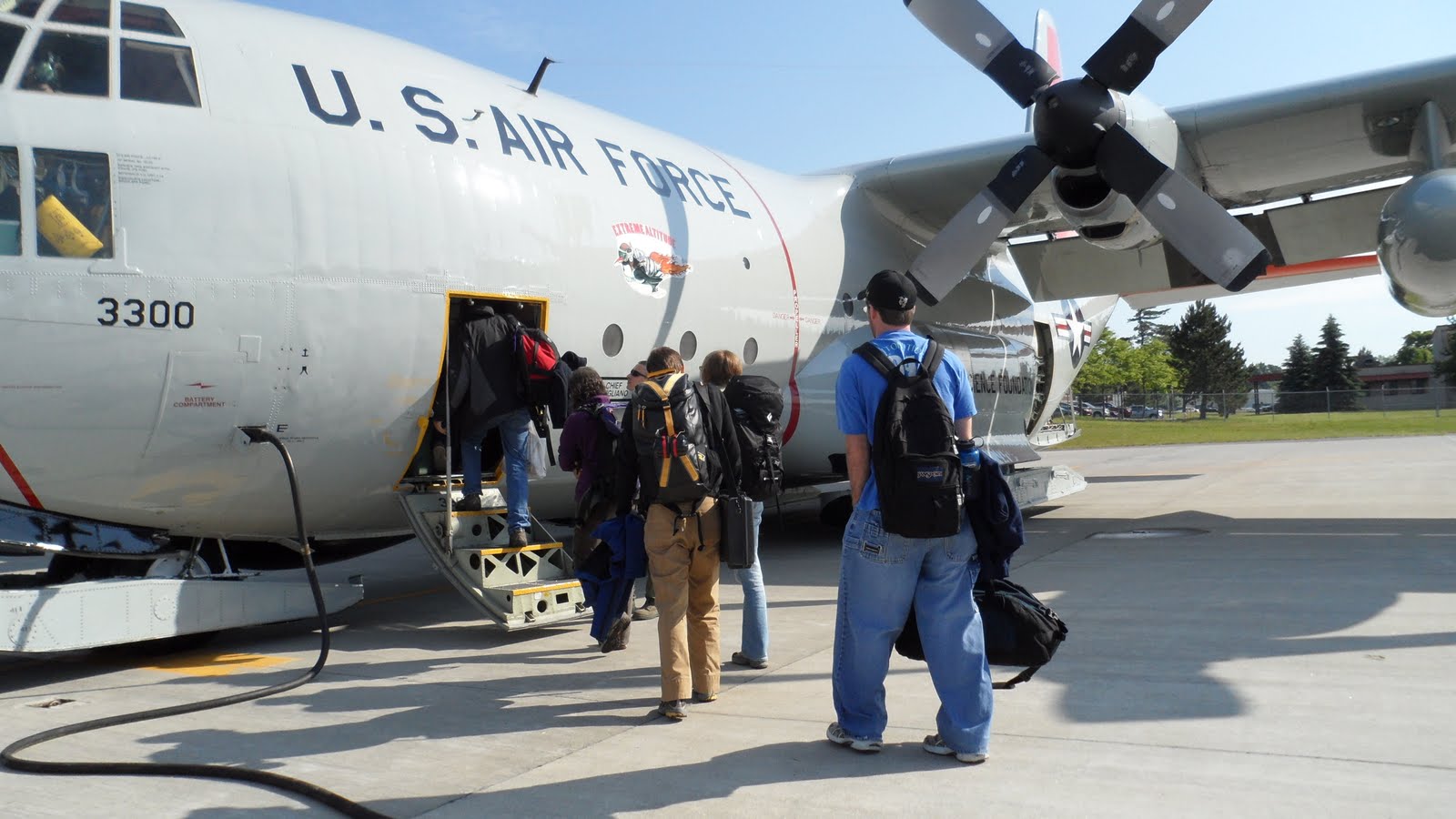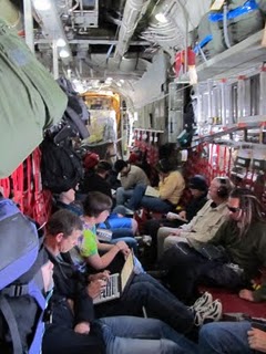 We were picked up early by the Air National Guard at the hotel and taken to their base in Scotia, NY, approximately 20 minutes away. Here we walked through a comical security checkpoint, which consisted of putting our baggage and anything metallic (i.e. assault rifles, knives, or swords) onto a table, walking through a metal detector, and getting our un-inspected belongings on the other side. After sitting in a room for about four hours, we boarded our plane for Greenland, an LC-130. These planes are so loud that you must wear ear-plugs while in transit. They also are not optimized for passengers, as they are mainly cargo planes. The picture pretty much sums up the 7-hour flight….uncomfortable and crowded. A long time later we landed at our destination, Kangerlussuaq, a small settlement in a deep, U-shaped glacial valley along a massive fjord in southwest Greenland. The airport here is the most frequented in the country, and the only one that can support large planes.