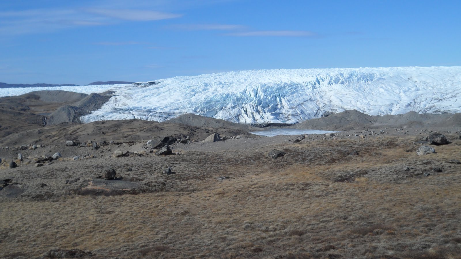 After some boring safety training in the morning regarding our trip to Summit, we were off down the road to the Ice Sheet. It was a very bumpy ride…everyone in the back had to hold on for their lives. Our driver, Von, a scientist in my group from the University of Idaho, pushed that little Toyota to its limits! On the way, we passed through glacial valley after valley. There were semi-frozen ponds and huge lakes everywhere.
