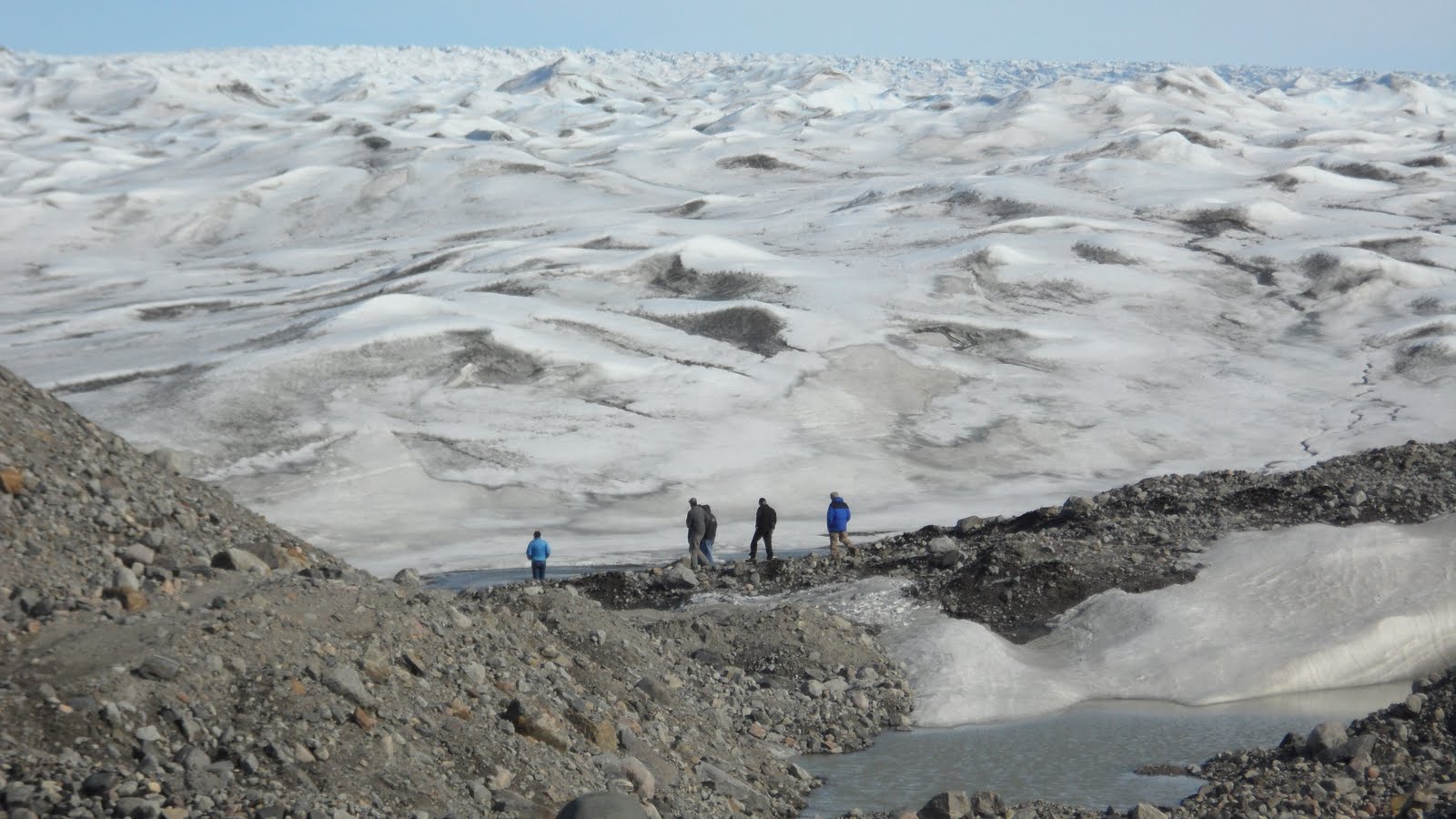 Finally, after over an 90 minutes, we reached the edge of the Ice Sheet! The texture on the ice near the boundaries is remarkable! The strong, cold breeze flowing off the edge of the glacier was refreshing. This persistent wind near the edge of the ice is called a glacier breeze, and is very similar in formation mechanism to a sea breeze.