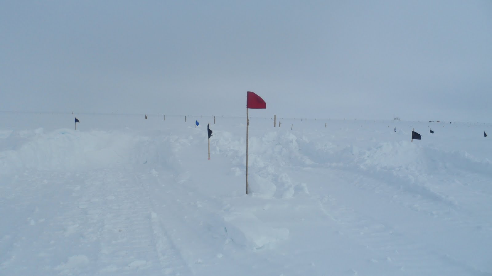 The only source of fresh water in this remote of a location is the snow. Large machines scoop up shovels of snow from designated locations and place it into hatch where it is melted by the excess heat from the giant diesel generator that powers the camp. This process is not very efficient, therefore causing showers and laundry to be severely limited on-site. Black flags mark the 12-foot deep pits where the snow is excavated to prevent anyone from falling in. Red flags, like the one shown here, mark the path from one building to another. In some cases during storms, visibility becomes so limited (usually from blowing snow, but also from falling snow) that these flags are needed to get around and lessen the chances that someone could get turned around and get lost on the ice.
