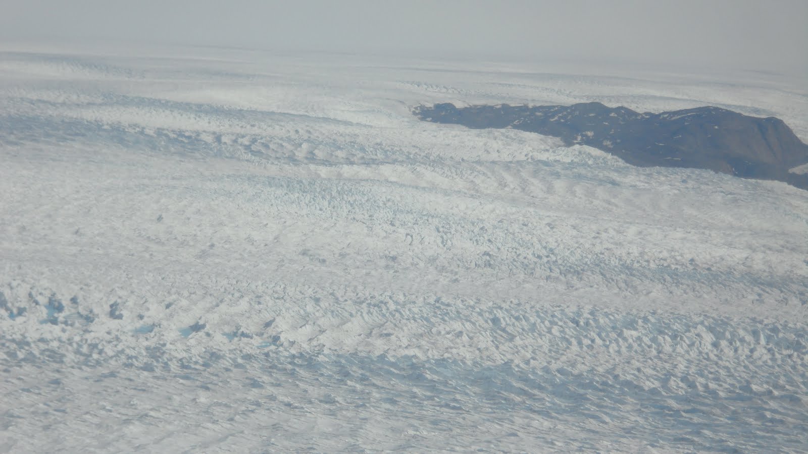 My final morning at Summit before the plane arrived to pick us up was a balmy 28 degrees. This abnormally warm temperature made the snow-packed runway a little slushy. The plane landed, cargo was unloaded, and without further adieu, we boarded for take-off. The plane sped up for take-off, like any other plane would. After about ninety seconds at this high speed the engines shut off and the plane rapidly decelerated, stopping just shy of the runway’s edge. An airman from the cockpit signaled for the guys in the back to move baggage to the rear of the plane. Actually taking off on a slushy snow surface is no easy task…especially with a few palates of cargo and twenty passengers. The plane could just not get enough speed with the increased runway friction. After moving the baggage, they gave it another go….fail. The airmen then proceed to move passengers to the back of the plane to sit on the floor. We were all strapped in like cargo. It was at this time that the guard guys cautioned us not to take any pictures. One girl’s camera was actually temporarily confiscated. This procedure was clearly against some sort of protocol and they did not want any record of it. On what seemed like our fourth or fifth take-off attempt, you could feel the nose of the plane finally get good elevation..and even the whole plane off the ground. After violently slamming back onto the snow surface several times, giving everyone that was strapped to the floor a hardy jolt, the C-130 made it airborne! This somewhat frightening event was over! A round-of-applause and cheers emanated from the rear of the plane, from passengers and airmen alike. It was all smiles for the duration of the two-hour return flight to Kangerlussuaq. I took several photos out of a window in the plane..