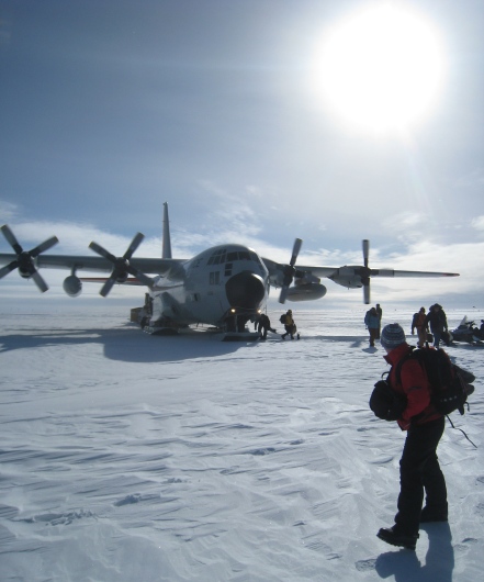 The C-130 landing at Summit on the snow-packed runway, or skiway as they call it. Notice the skis the plane has instead of wheels.