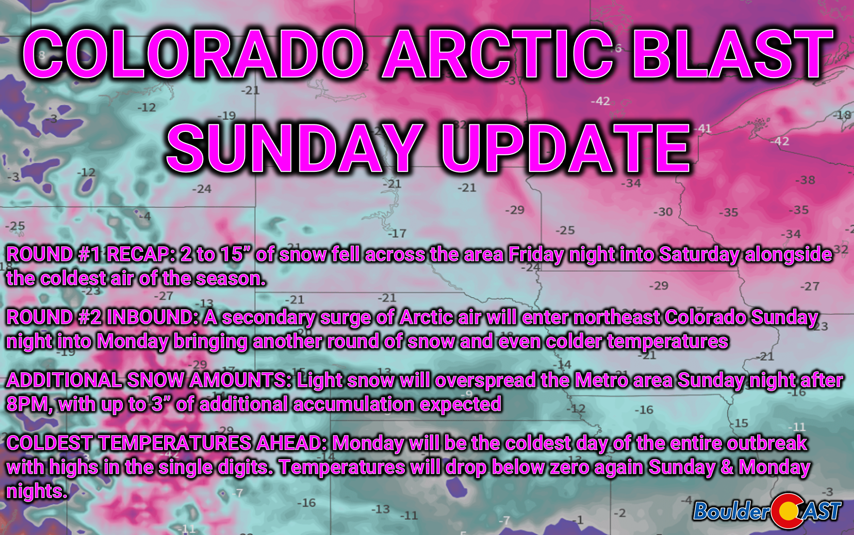 - Round #2 Inbound: A secondary surge of Arctic air will enter northeast Colorado Sunday night into Monday bringing another round of snow and even colder temperatures