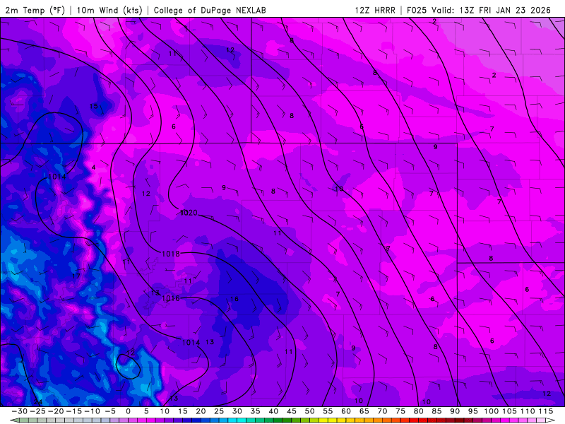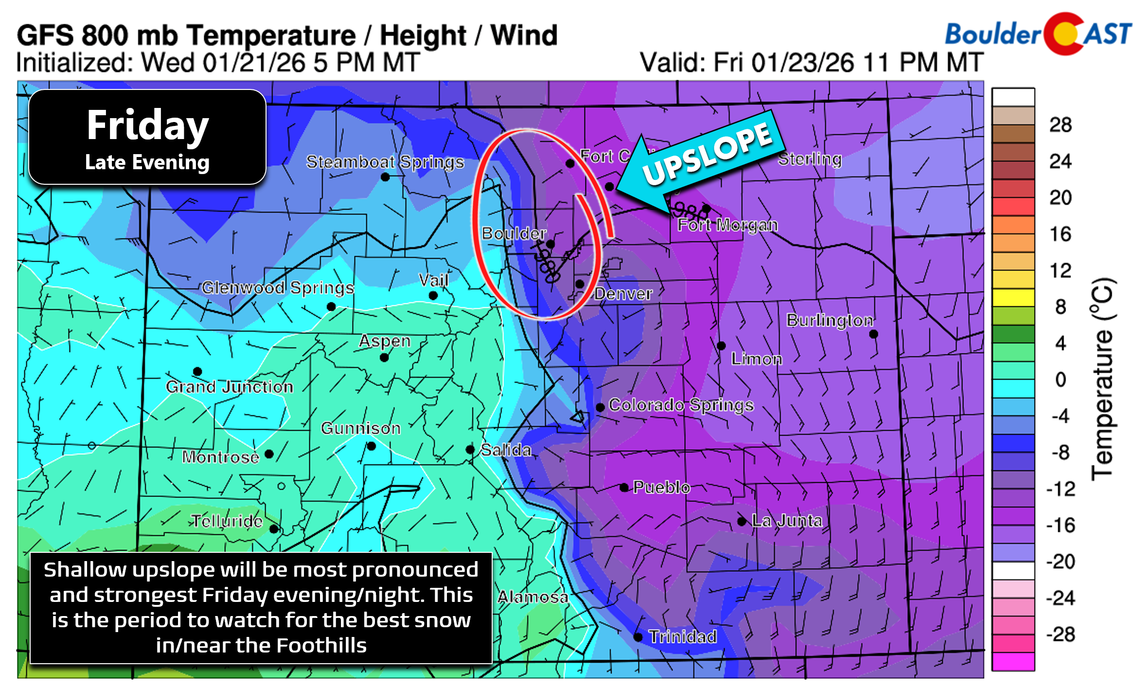 While a weak cyclone is plausible, guidance is almost certainly overdoing its strength and coverage. Boulder and the northwest Metro area will remain locked into the cold regardless, with highs only in the teens. Some parts of south/east Denver will reach the 20s.
