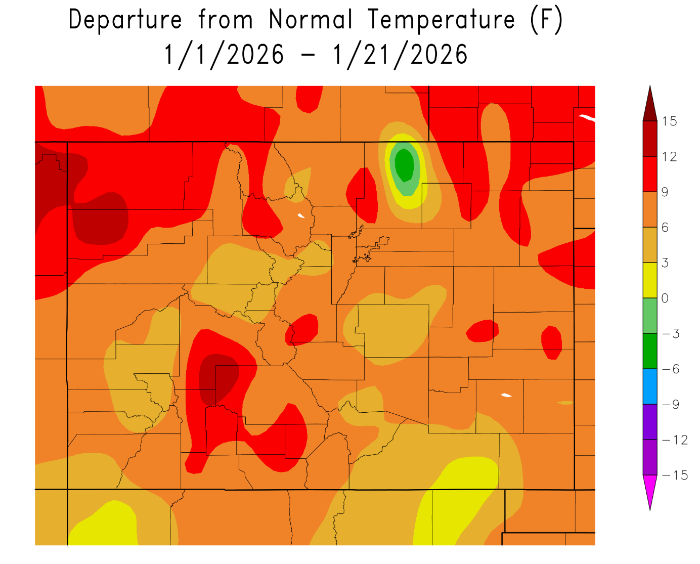 Much like the final month of last year, the opening stretch of 2026 has been astonishingly warm across the Front Range. We’ve stacked up far more unseasonably mild days than climatology would ever suggest is reasonable for January. The High Plains and northern Rockies have been the epicenter of this warmth, running some of the most anomalous temperatures in the entire country through the first three weeks of the New Year. You practically need a magnifying glass to find any region of the Lower 48 running below normal during this period.
