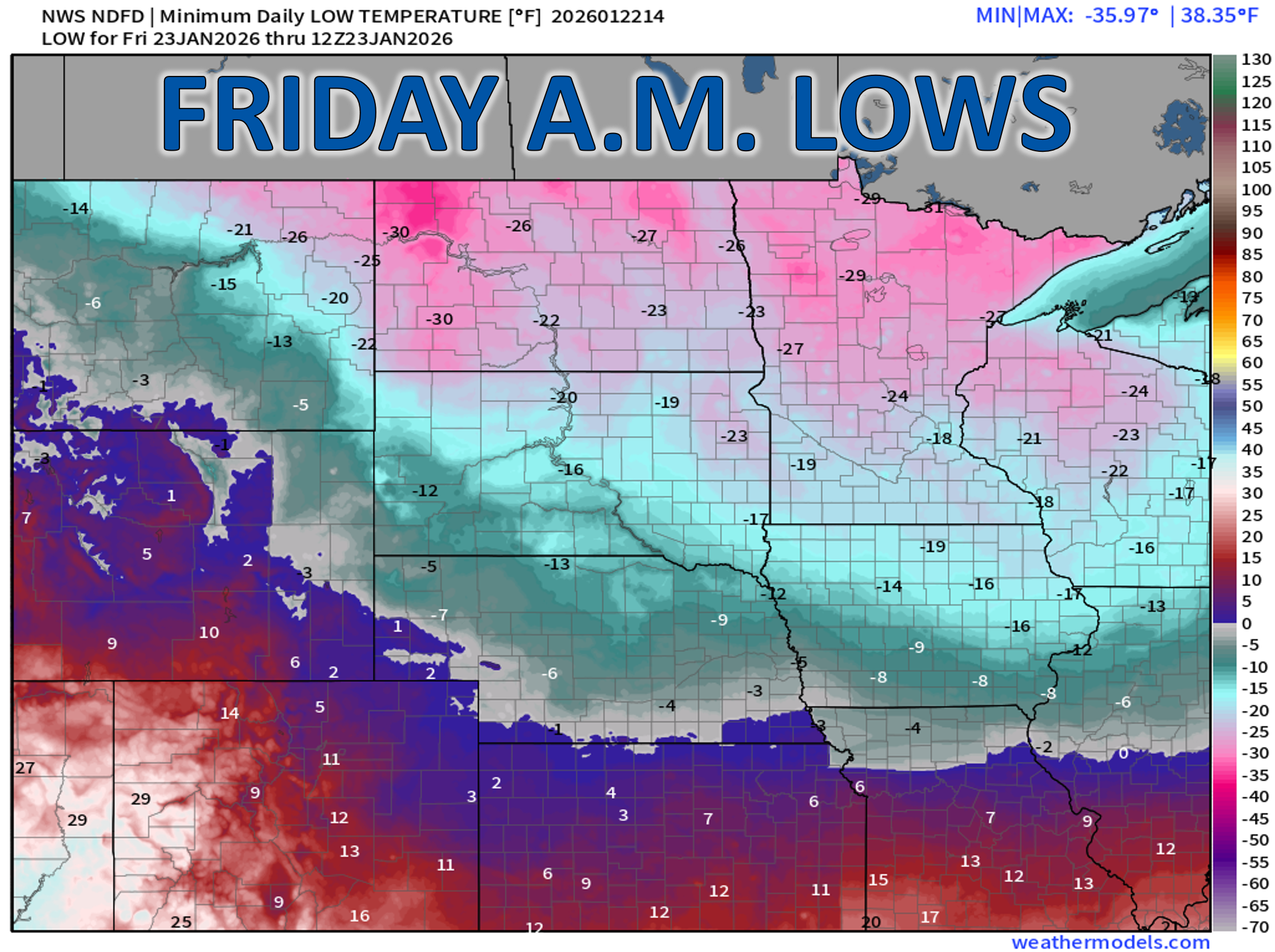 By sunrise Friday, the cold air will be entrenched across the region with lows near 10°F—but this is just an appetizer.