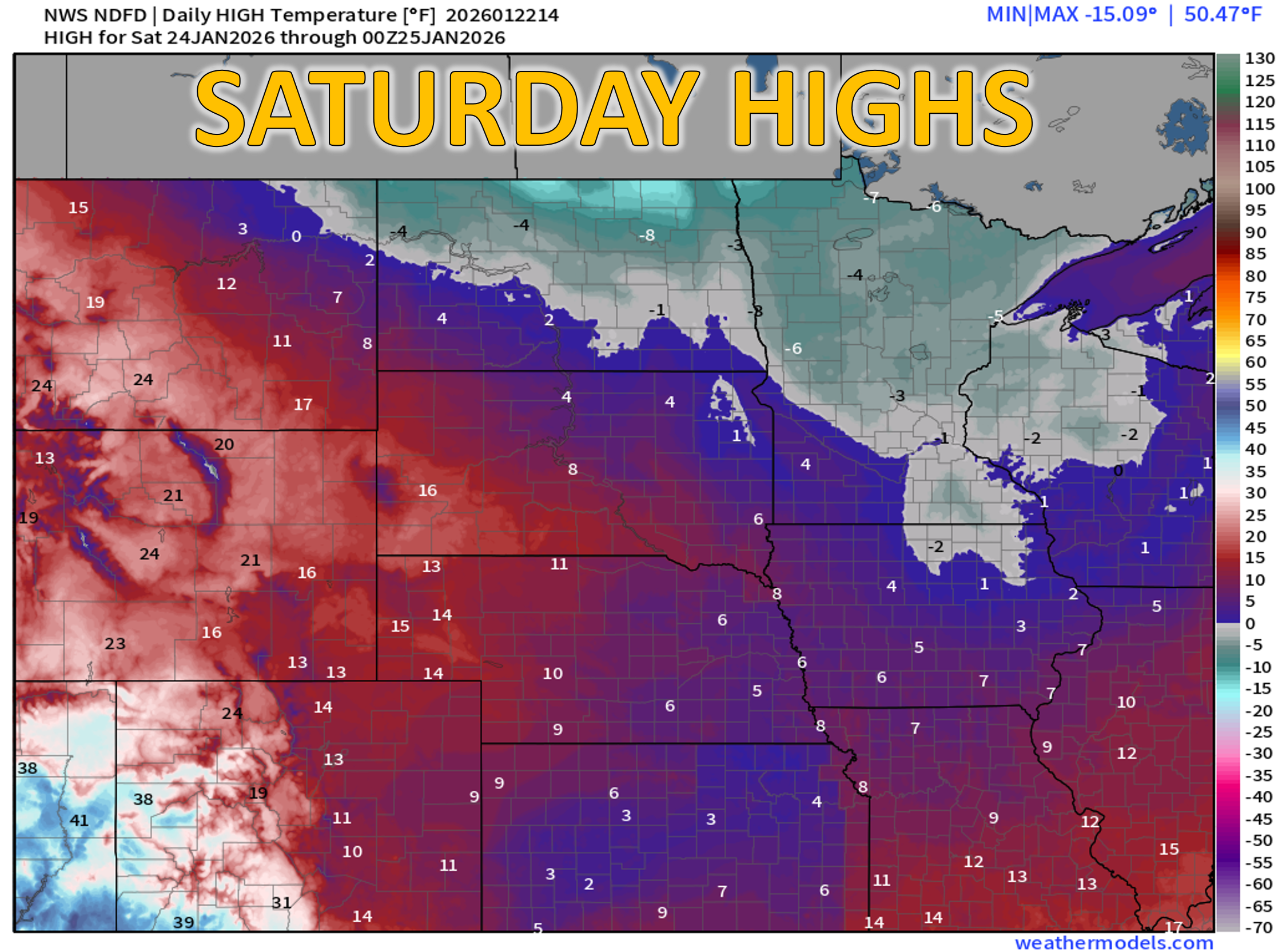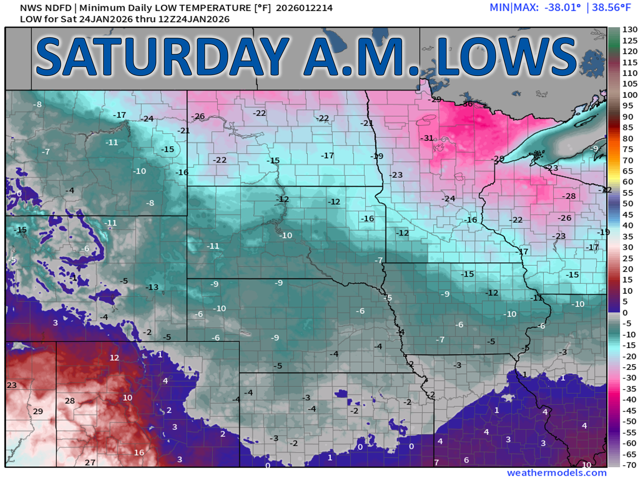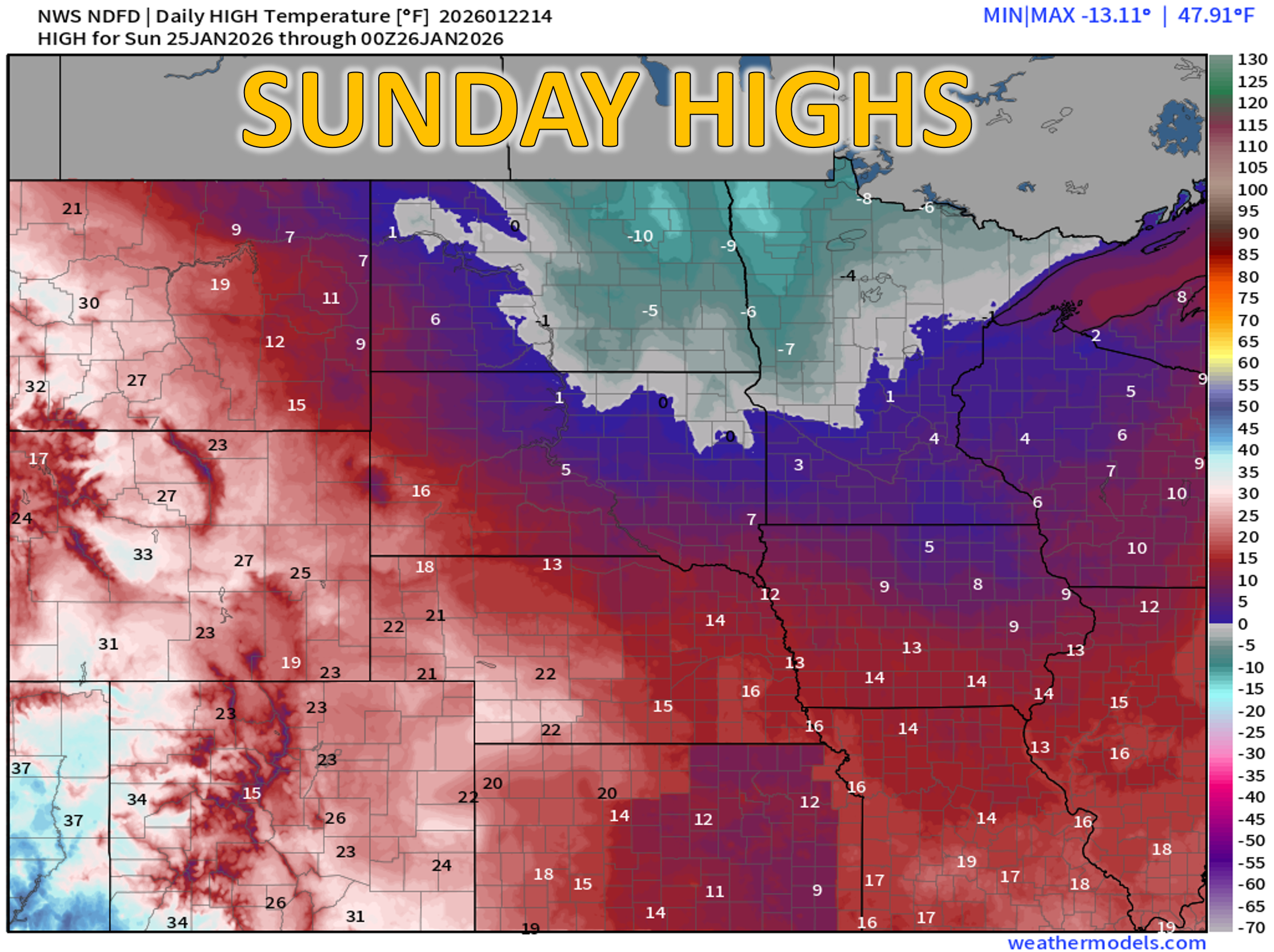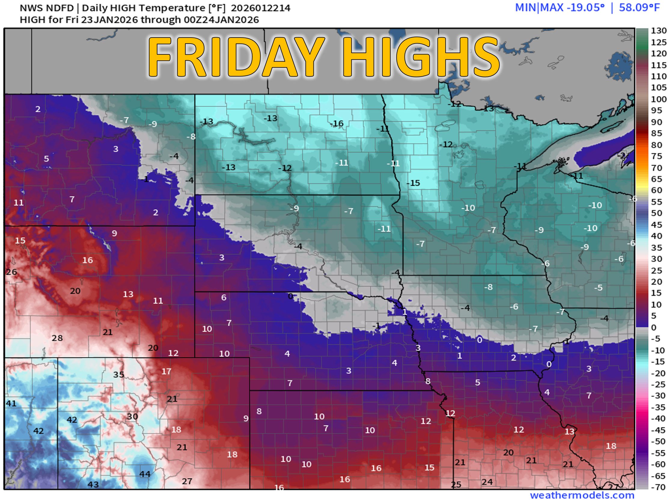 - 📉 Coldest stretch of the season — Highs in the teens Friday–Sunday, widespread subzero lows Saturday night