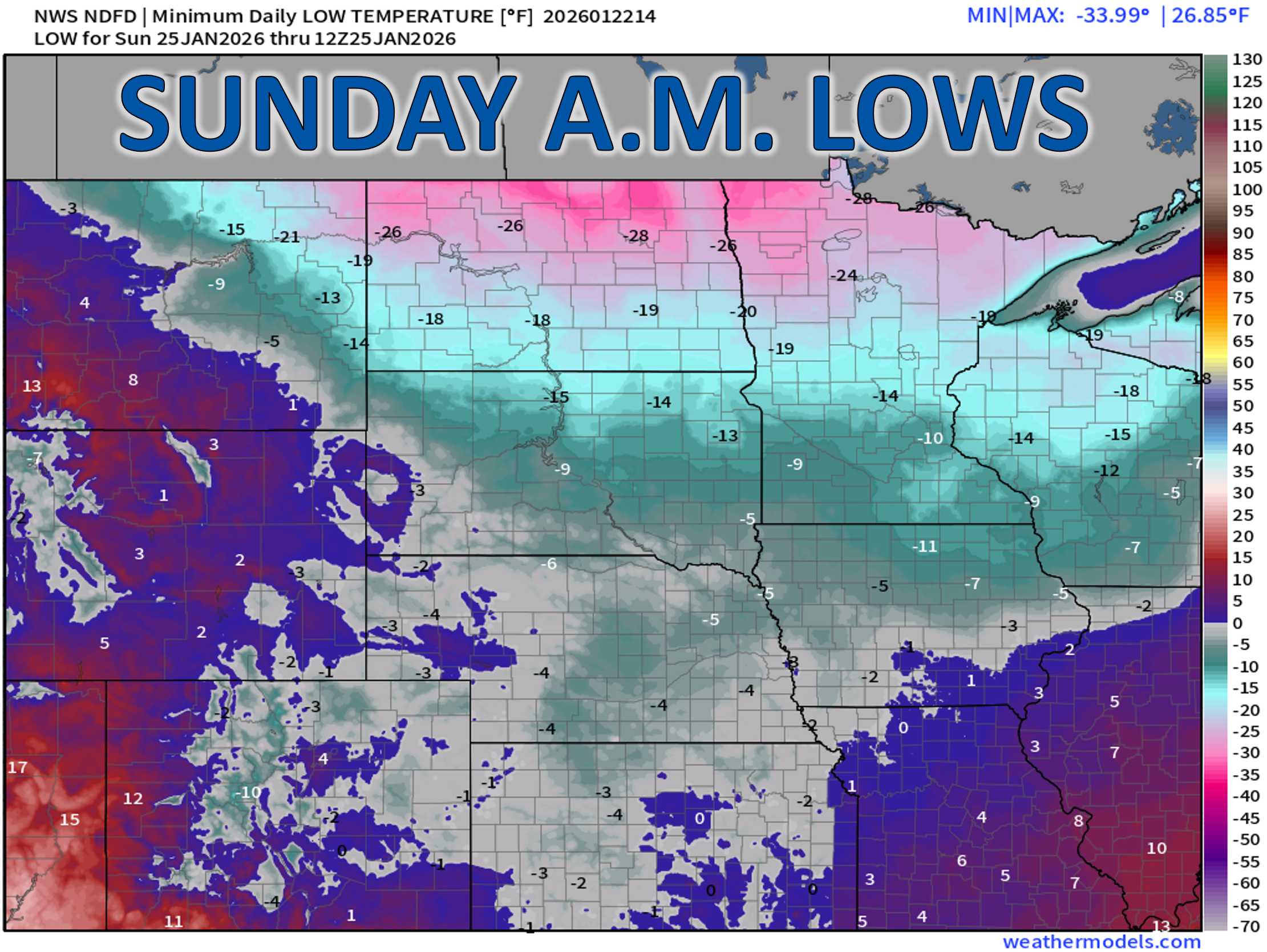 Skies should clear Saturday night, and with fresh snow on the ground, radiational cooling will be extremely efficient. Expect the coldest night of the entire event: widespread subzero lows, generally –1 to –8°F, with the usual cold pockets flirting with –10°F or colder.