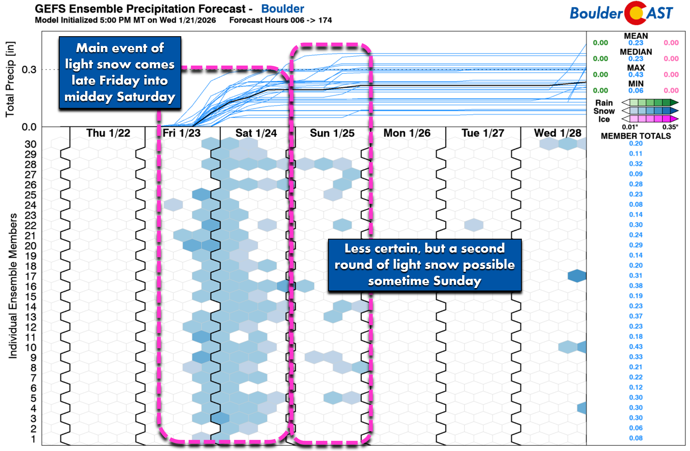 The main window for accumulating snow runs from late Friday afternoon through Saturday morning, when 0.05″ to 0.25″ of liquid is on the table—highest in and near the Foothills, lowest across the northeastern Metro area. A secondary, very light round of snow may accompany Sunday’s reinforcing cold surge.