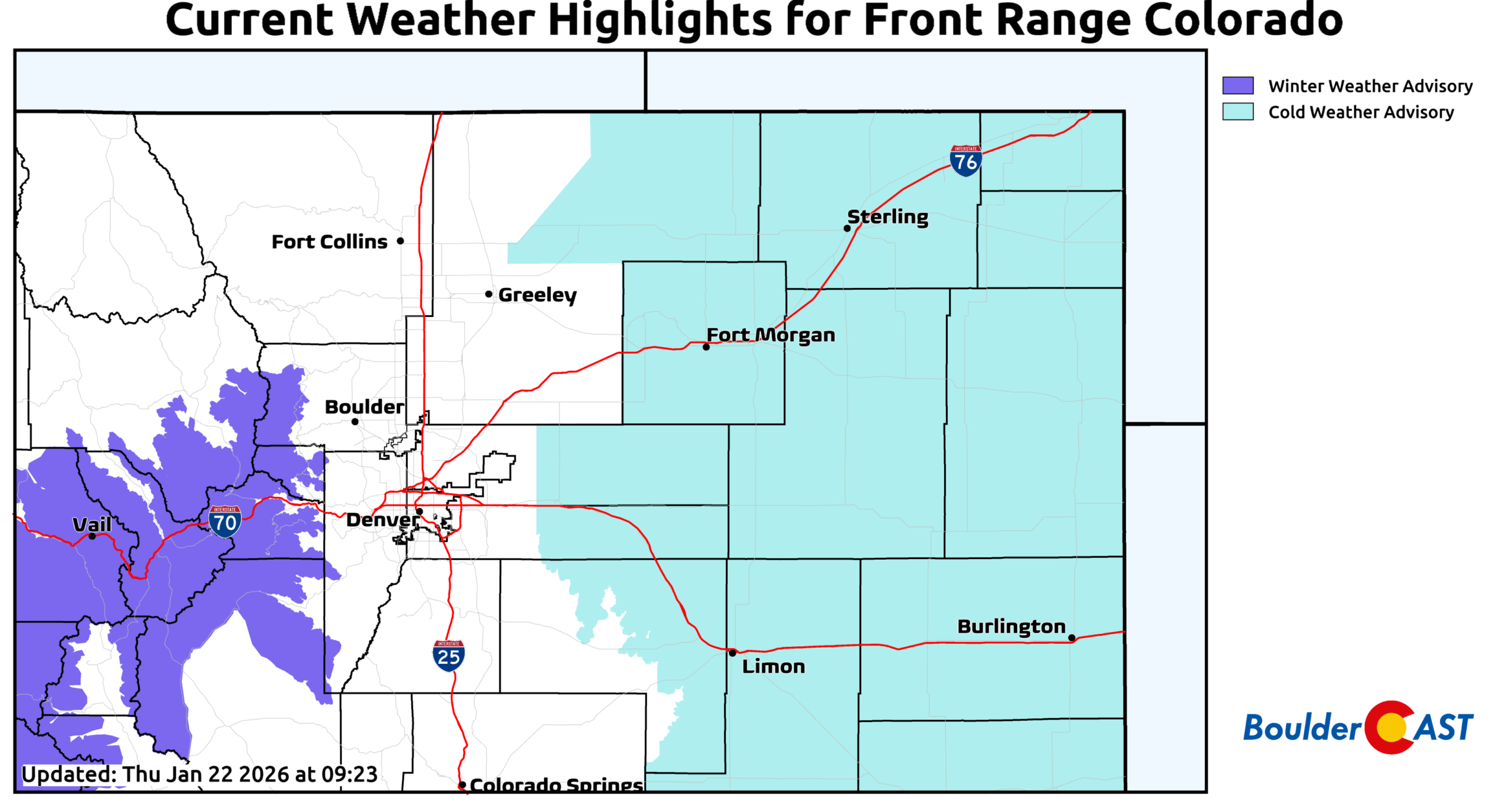 - 🧊 Hazardous cold east of Denver — A Cold Weather Advisory is in effect for the eastern Plains with wind chills as cold as –20°F (NOT including Boulder/Denver).