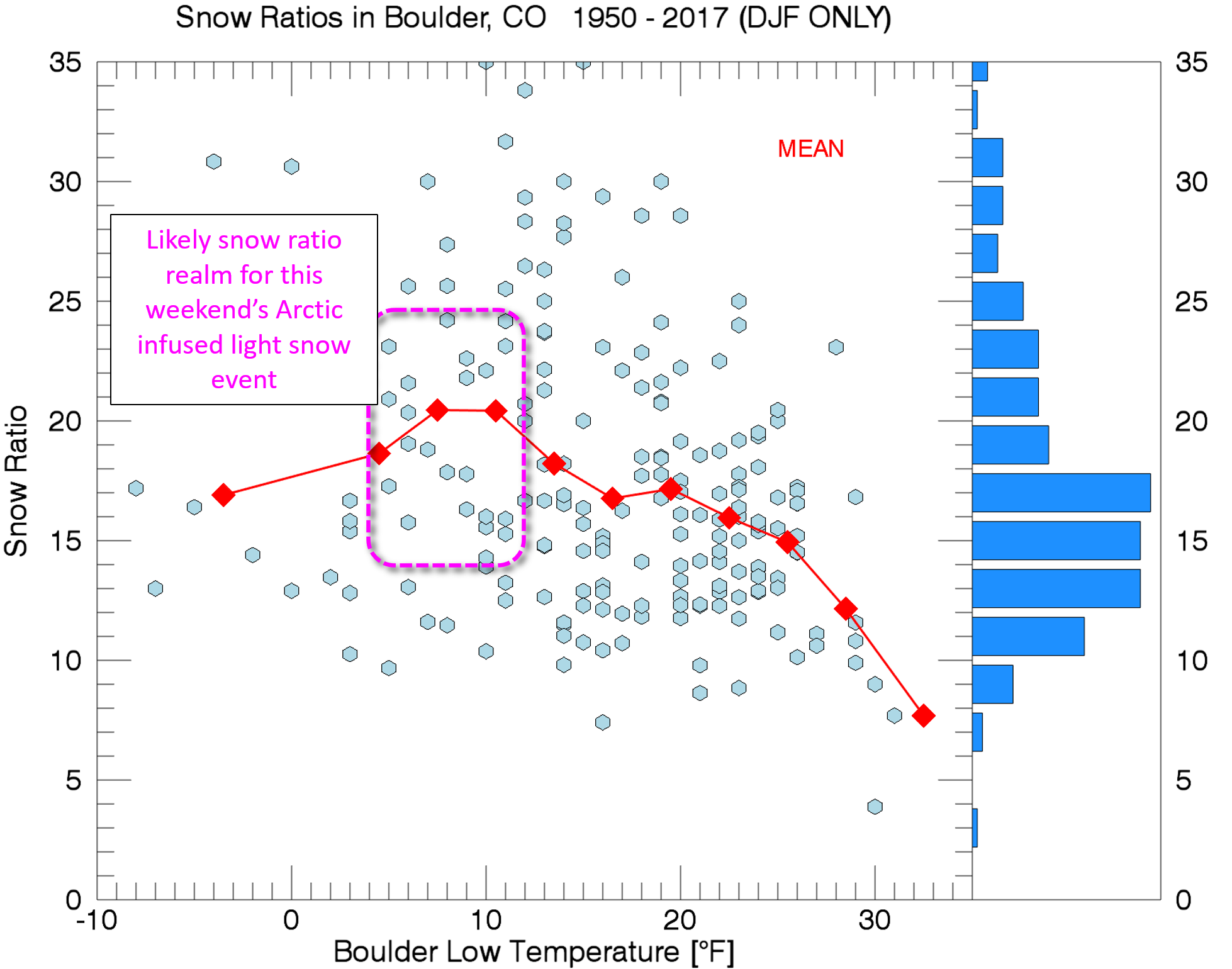 Moisture is meager with this Arctic airmass, so we’re not expecting a ton of snow to fall out of it. Precipitation amounts around 0.05 to 0.25″ are possible Friday into Saturday, with the highest amounts in/near the Foothills where shallow upslope of the dense Arctic air will do its best work.