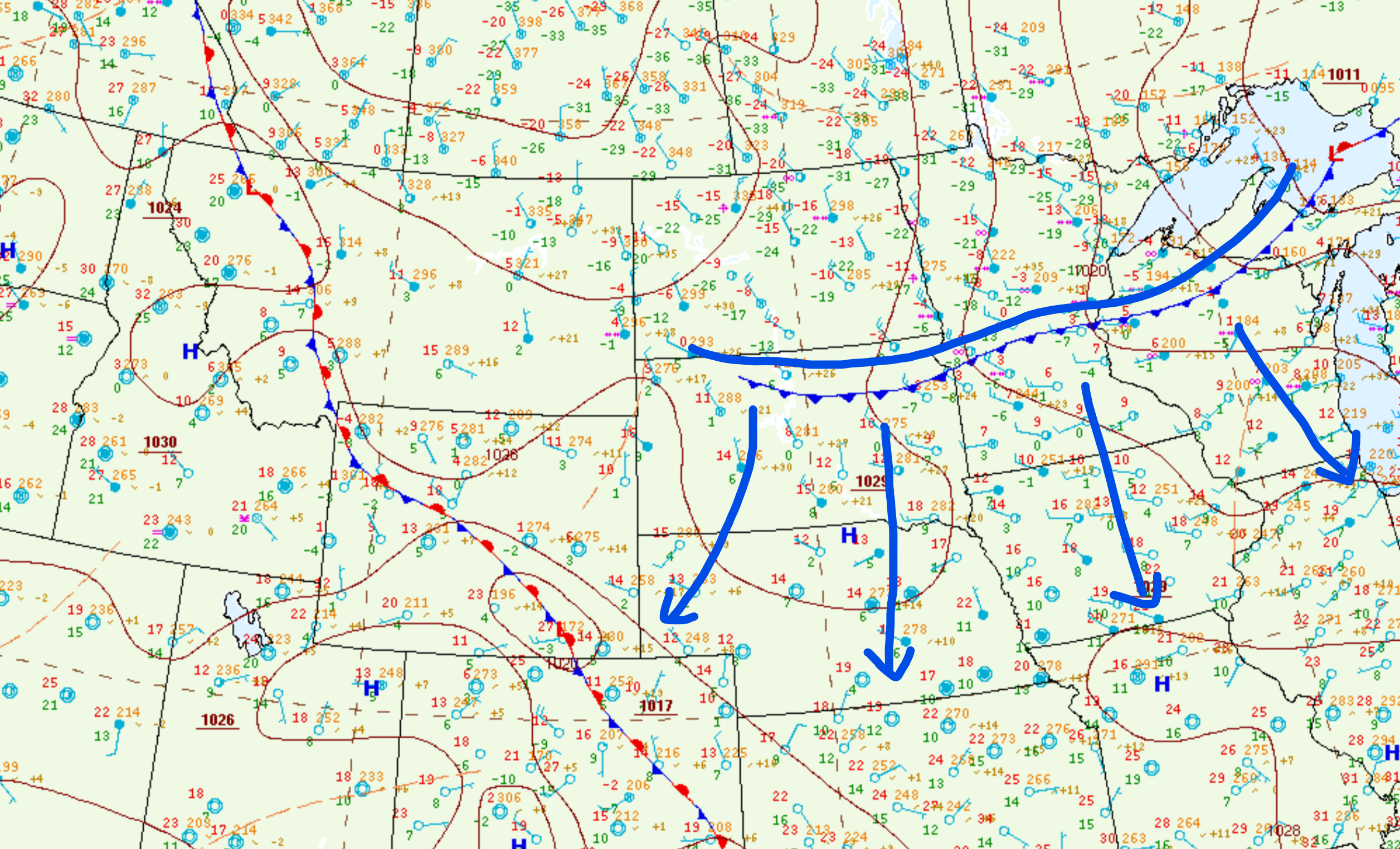 As we outlined in Monday’s weekly outlook, that warm streak is about to hit a brick wall. A bona fide Arctic airmass—something that has repeatedly not made it into Colorado all winter—will finally take a direct aim at eastern Colorado beginning Thursday evening. Up until now, the coldest air of the season has consistently plunged into the Midwest and Great Lakes, leaving us on the mild western fringe of things. As of Thursday morning, the leading edge of the cold front is draped across the Dakotas and preparing to surge south.