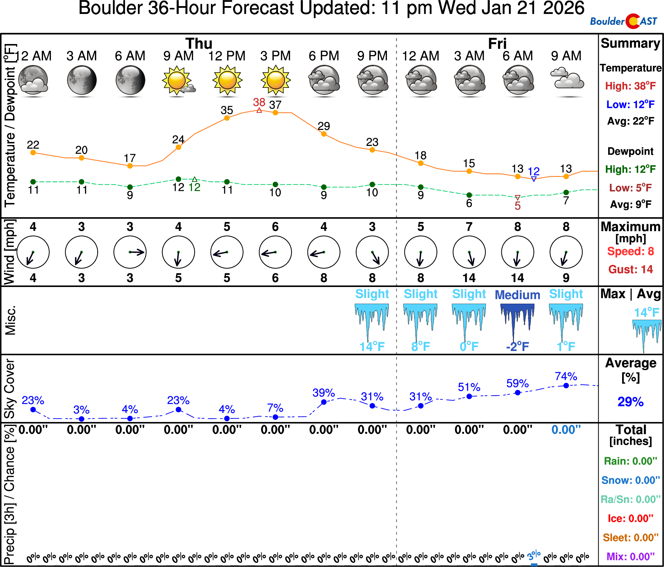 This Arctic air will ooze southward through the day Thursday, eventually backing into the Boulder–Denver corridor from the east Thursday night. This won’t be a dramatic frontal passage with howling winds and a sudden temperature crash. Instead, expect a slow, methodical intrusion of cold air creeping into the area late Thursday evening and continuing into early Friday morning. A secondary reinforcing surge of even colder air is slated to arrive later in the weekend, ensuring the Front Range stays firmly frozen through at least Sunday night. Yes, there will be snow, but not much (we’ll talk about this in a moment). The real headline is the bitter cold—easily the coldest stretch of this unusually warm winter season so far.