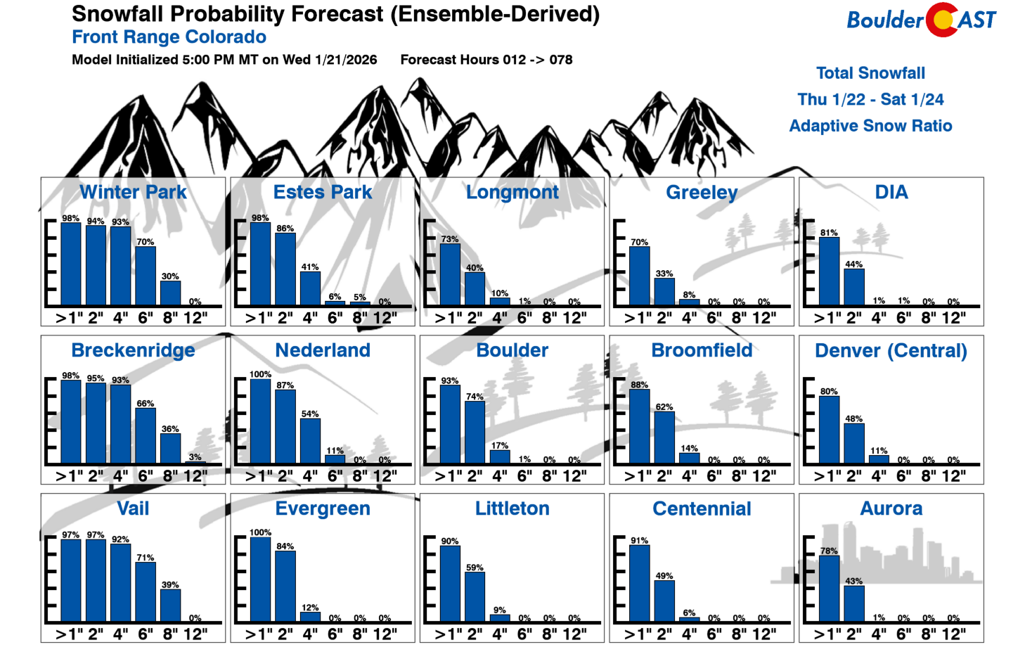 Our latest Snowfall Probabilities give most of the Front Range a good shot at picking 1 to 2 inches of snow, but little hope to see much more than that. Boulder leads the way across the lower elevations with just a 17% chance to see more than 4 inches of snow.