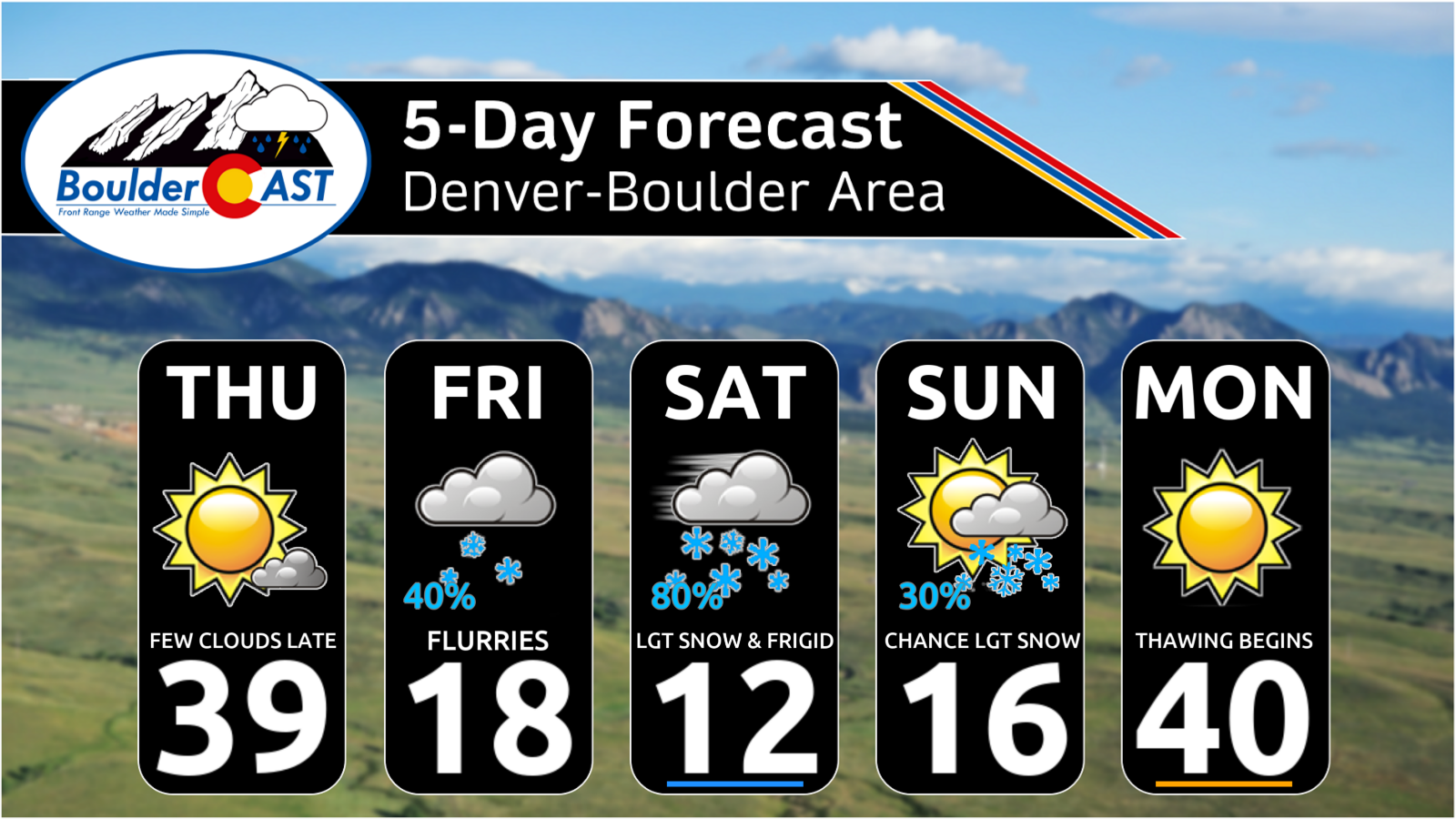 Saturday remains bitterly cold with highs only in the low to mid teens across Boulder and Denver. The Arctic airmass will be fully established, and this probably lands as the coldest day of the outbreak.