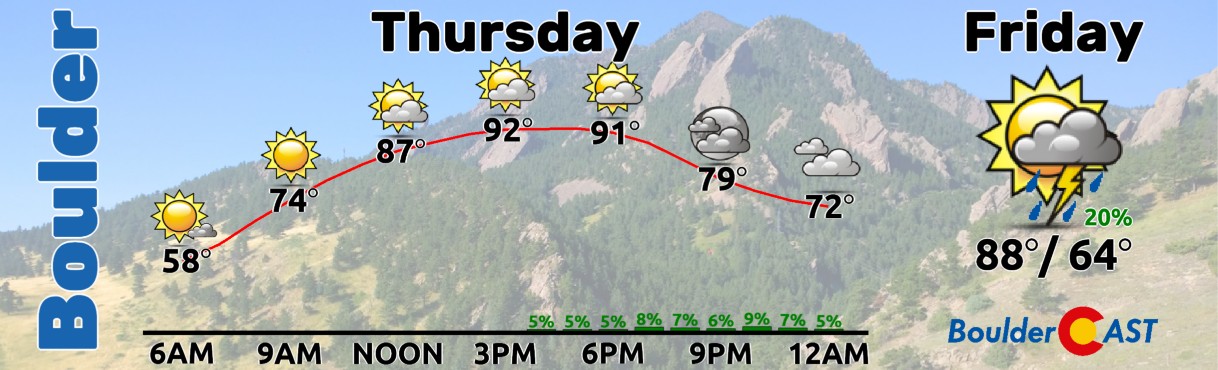 - Hot Thursday: Highs in the lower 90s with only a slight chance (10–20%) of evening storms along the Front Range.