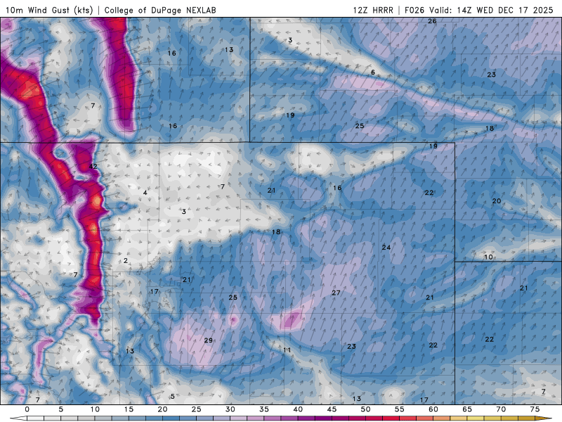 The primary concern right now is for a relatively short-lived but extremely intense period of winds in the Foothills, Boulder and the western suburbs of Denver as a mountain wave briefly develops during the day Wednesday ahead of the cold front. With previously mixed forecast guidance, we were unsure whether this feature would come to fruition or not , but now that the short-range models have had their look, confidence has increased that this intense windstorm should indeed happen. The mountain wave dynamics are brief but will offer strong enhancement of winds from late morning Wednesday into the early evening. Winds will cascade down the eastern slopes of the Rockies into the Metro area, with gusts of 50 to 85 MPH possible west of Interstate 25. The latest run of the HRRR model below has winds shifting from almost calm in Boulder to an extreme wind event in the blink of an eye around midday Wednesday, with the strongest winds occurring Wednesday afternoon into early evening.