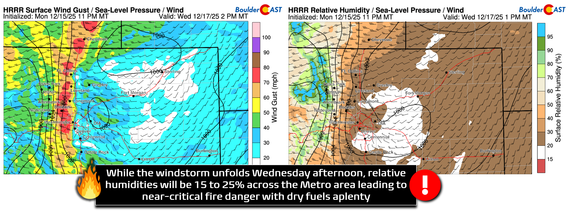 While humidities will mostly be above the threshold that would typically trigger a Red Flag Warning, the National Weather Service has opted to issue one anyways given the extreme winds in the forecast and the dry fuels present across the drought-stricken Front Range. Any fire ignition would have several hours to rapidly grow Wednesday afternoon into the early evening.