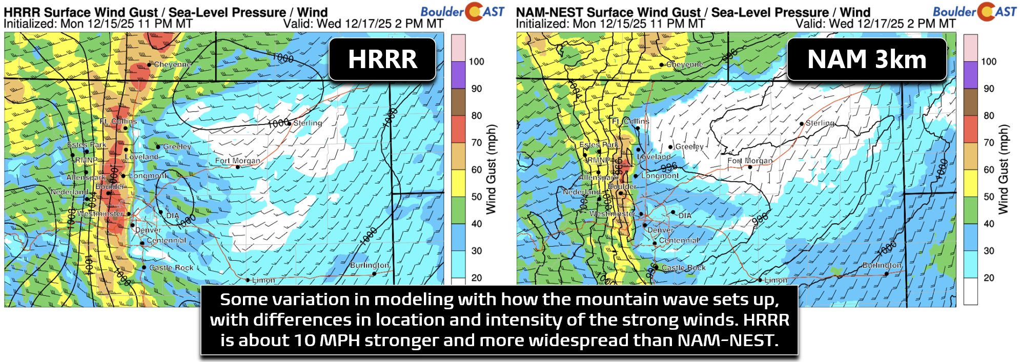 There are some differences in modeling with how far east the strong winds will reach, and also with intensity. This of course plays into which communities will be impacted versus spared. The HRRR model is about 10 MPH stronger and has the winds pushing eastward all the way to Interstate 25 if not farther (below left). The NAM is less intense and keeps things several miles farther west (below right).