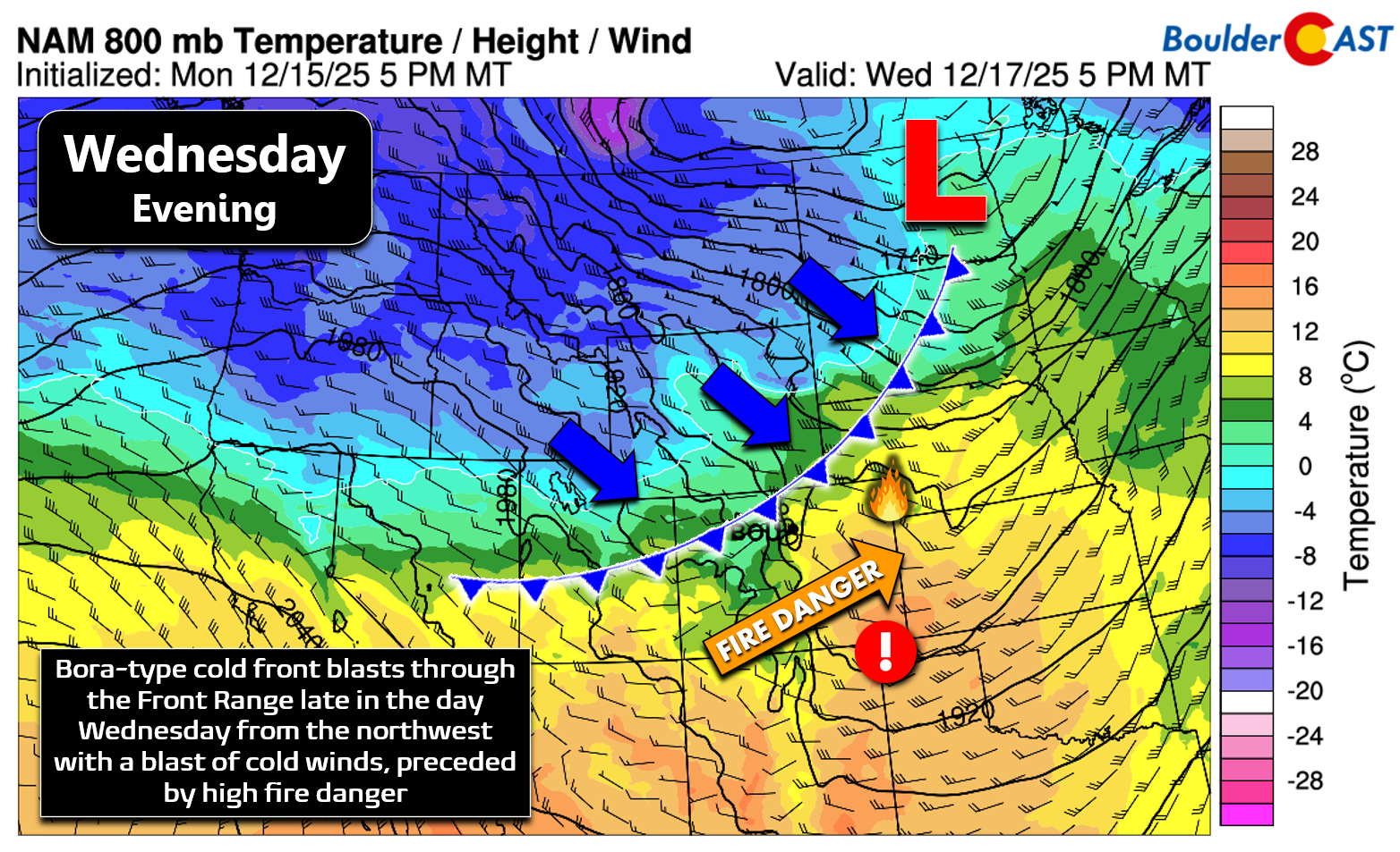 The fire danger and high wind risk will lessen as the main bora cold front arrives around or just after sunset Wednesday evening. Chilly bora winds will spill across the northeast corner of Colorado and up along the Wyoming Border. Latest guidance suggests these post-frontal winds won’t greatly impact the Denver-Boulder area, staying further north and east. This is good news, but Wednesday evening and night will still be blustery.