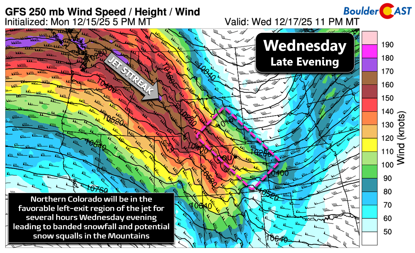 Our current ridge of high pressure will begin to break down Tuesday night into early Wednesday, and eventually it’ll get shunted southward by a punchy shortwave screaming along the Canadian Border Wednesday night. This system, and the intense jet streak wrapped around its base, will bring the Front Range a period of strong downslope winds during the day Wednesday into Wednesday night.
