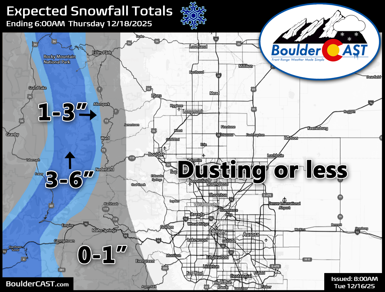 - 🏔️ Mountain snow — 3–6″ along the Divide with localized squalls and whiteouts; Foothills above 8000 feet <1″.