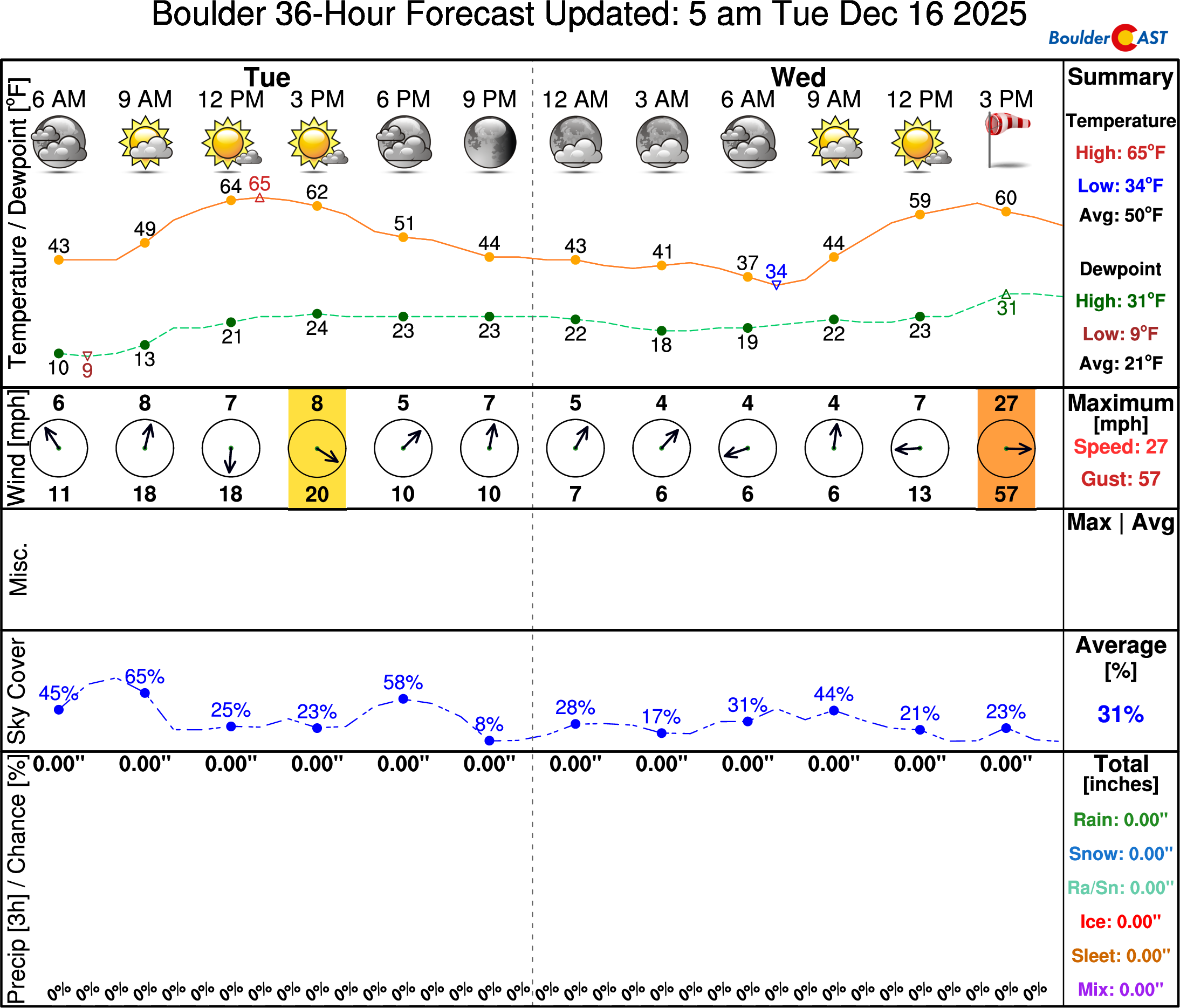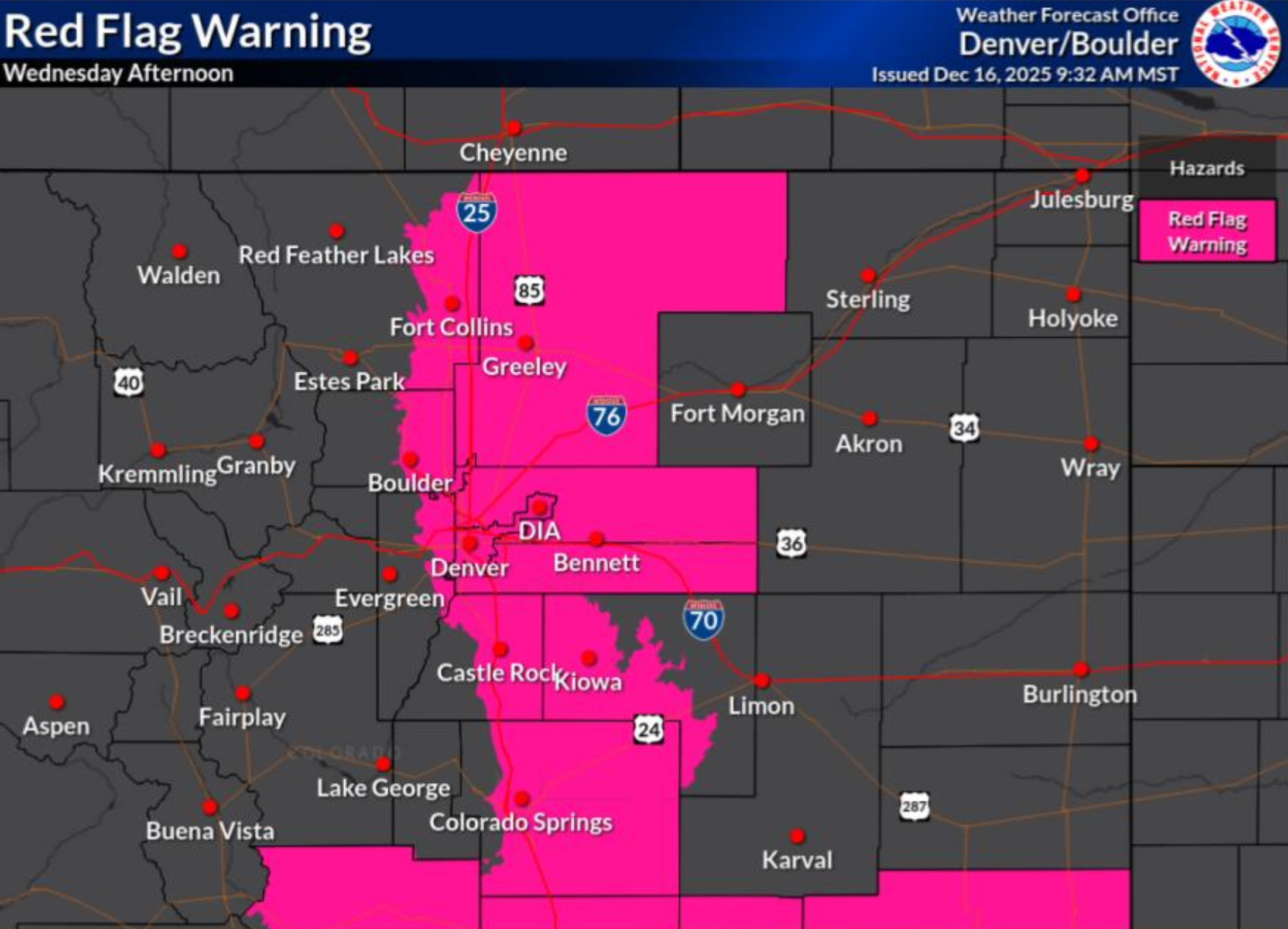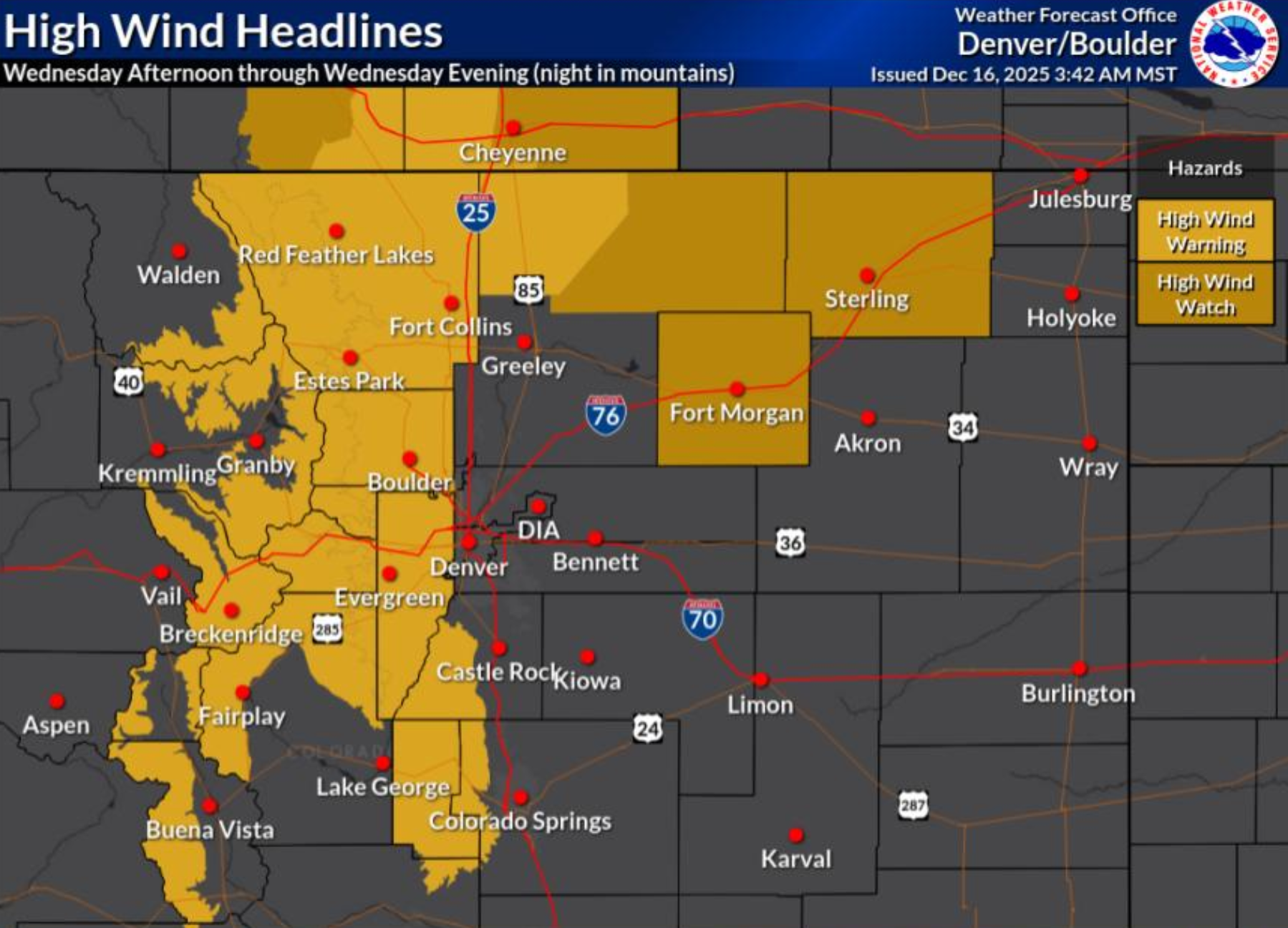 Boulder, the western Denver suburbs, the Foothills and the Mountains also have a co-timed High Wind Warning running from 11AM to Midnight on Wednesday.