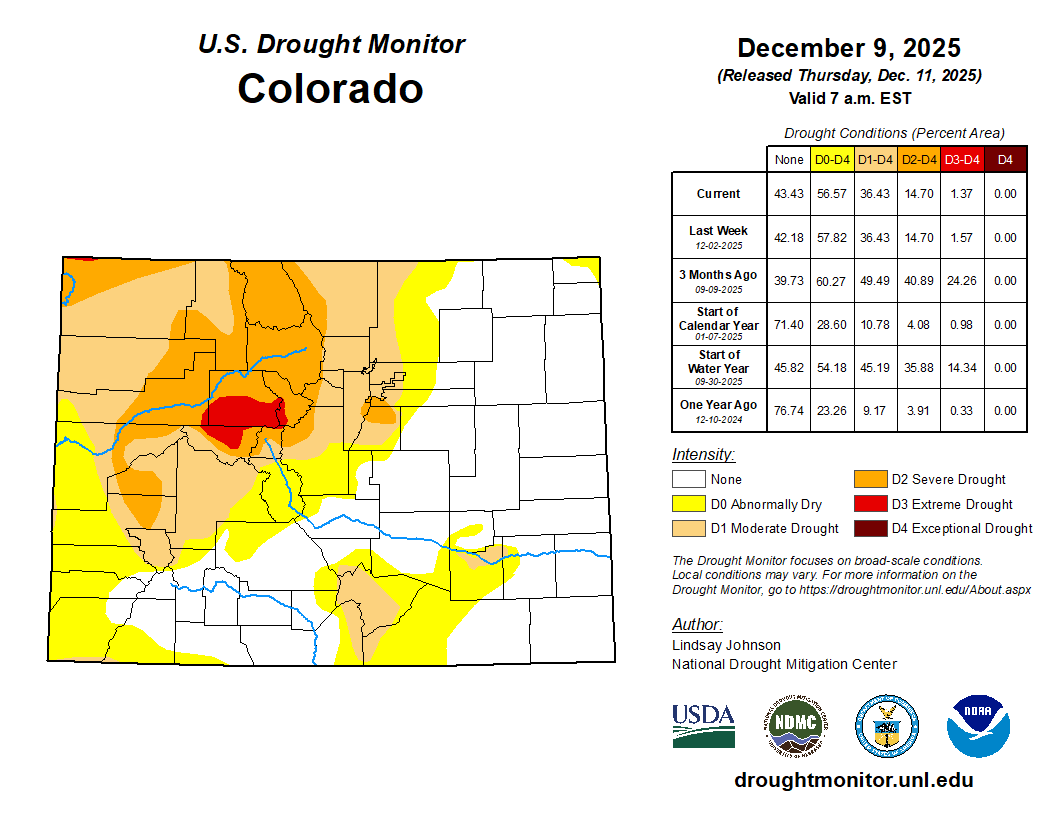 - ❄️ Cold front arrives Wednesday evening — blustery conditions, scattered rain/snow showers possible in Denver/Boulder 5–10PM, little accumulation.