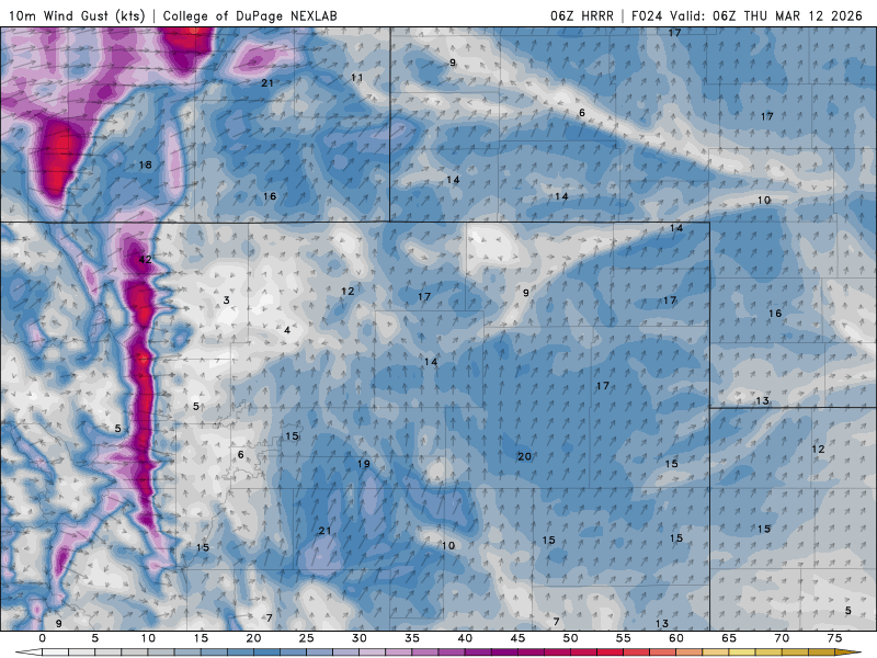 The latest HRRR run hints at ~70 MPH gusts clipping western Boulder and Highway 93 sometime Thursday afternoon into early evening.