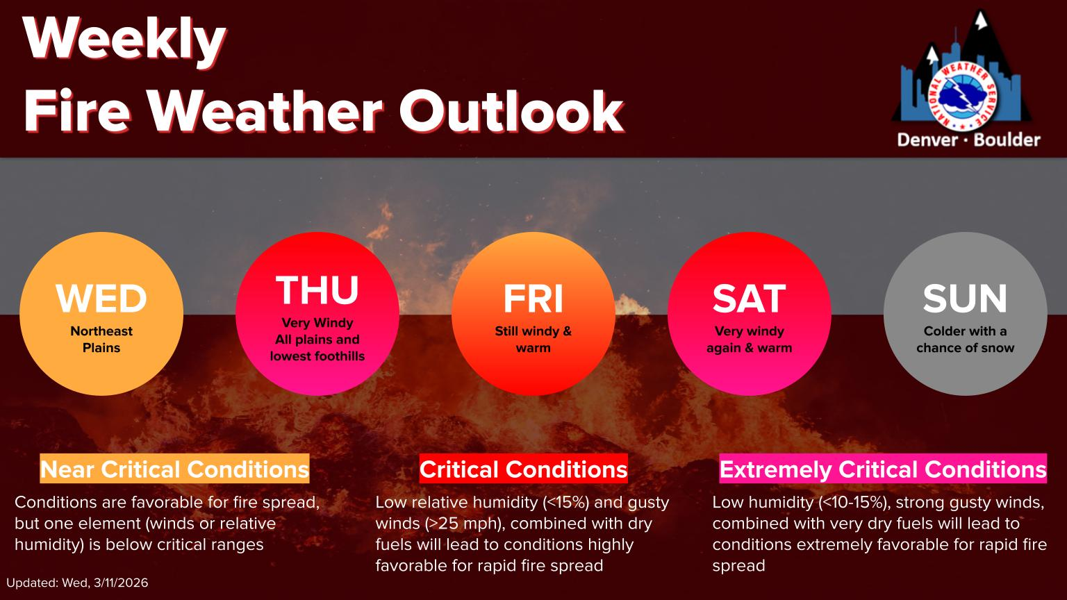 • ⚠️ Potential for damaging winds in Boulder Thursday, though this remains uncertain; everyone still sees 25–40 MPH gusts and critical fire danger.