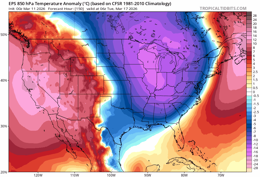 Looking ahead to next week, an intense ridge of high pressure remains on-track to bulldoze into the West. Colorado is staring down a multi‑day, late‑winter heatwave beginning Tuesday. The European ensemble temperature anomaly forecast animation below tells the story: a massive, persistent heat dome parked over the West for nearly a week straight. For mid‑March, the magnitude and duration of this feature are essentially unprecedented. Our area is likely to experience several consecutive days in the 80s. To put that into historical context, Boulder has only experienced 80° temperatures in March seven times in the last 140 years — 3 times in 1910, and then one time each in 1997, 2012, 2015 and 2017. Brace yourself for that familiar hum of air conditioning units next week, much sooner than anyone could expect.