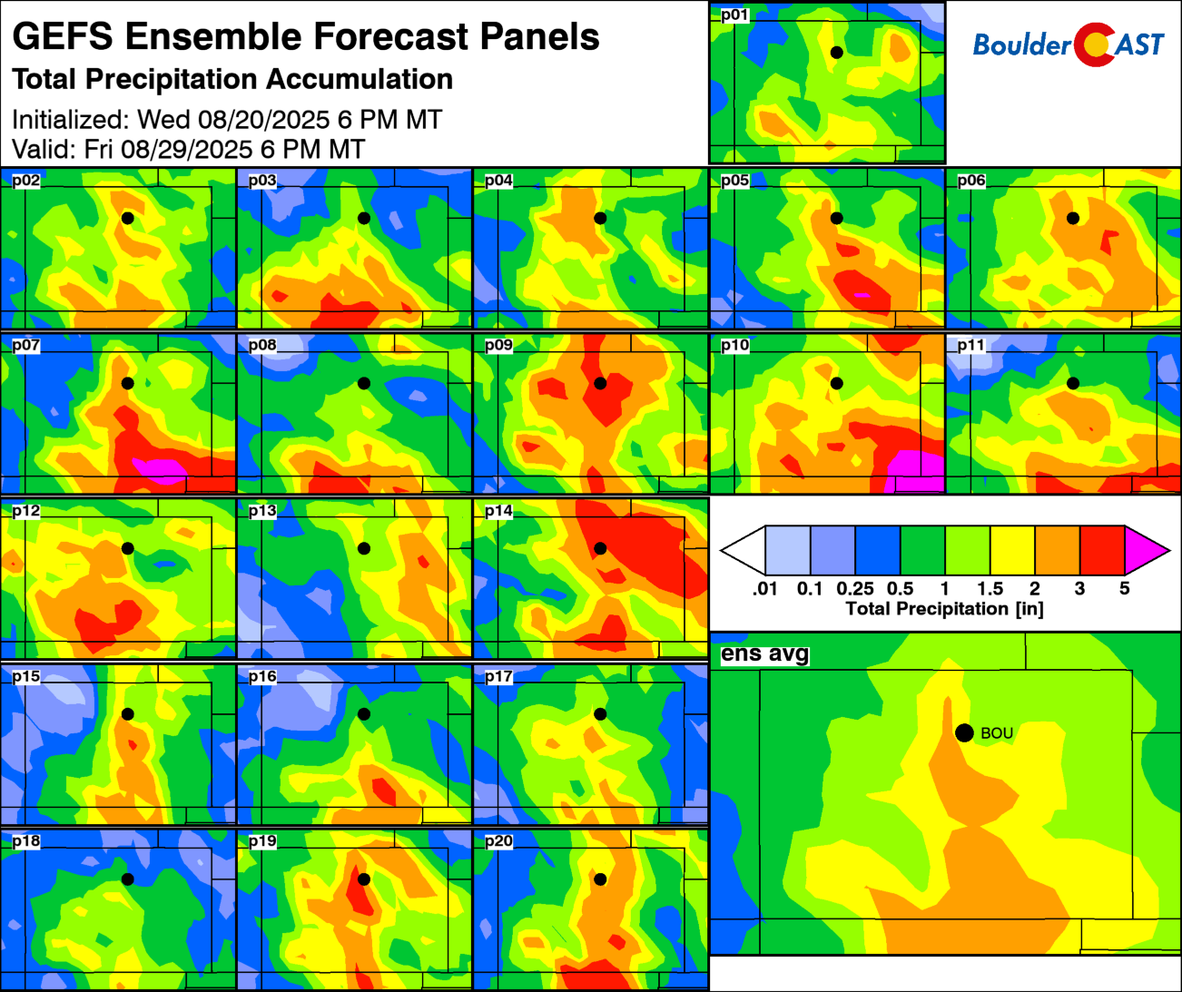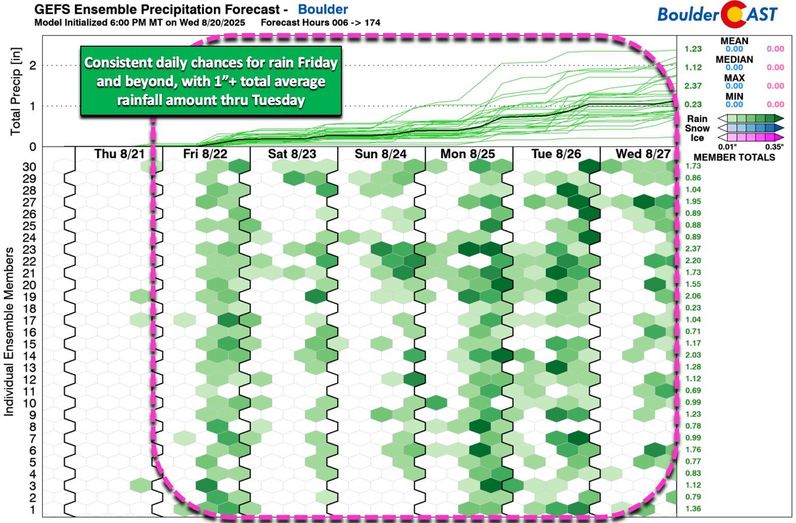 There has been an observable trend in the modeling which could favor central and southern Colorado for the best dump of rain over the next seven days. Colorado Springs to Pueblo (1.5-2.5″) may end up doing better than Boulder and Denver (0.75-2″), but it certainly won’t be “dry” here, regardless of the ultimate outcome.