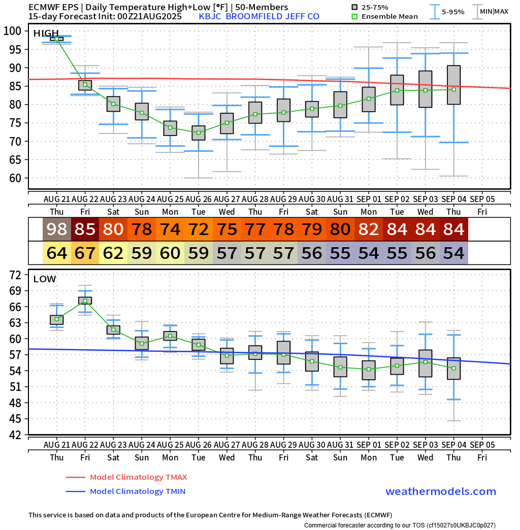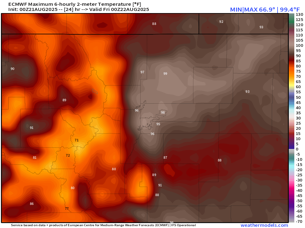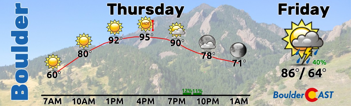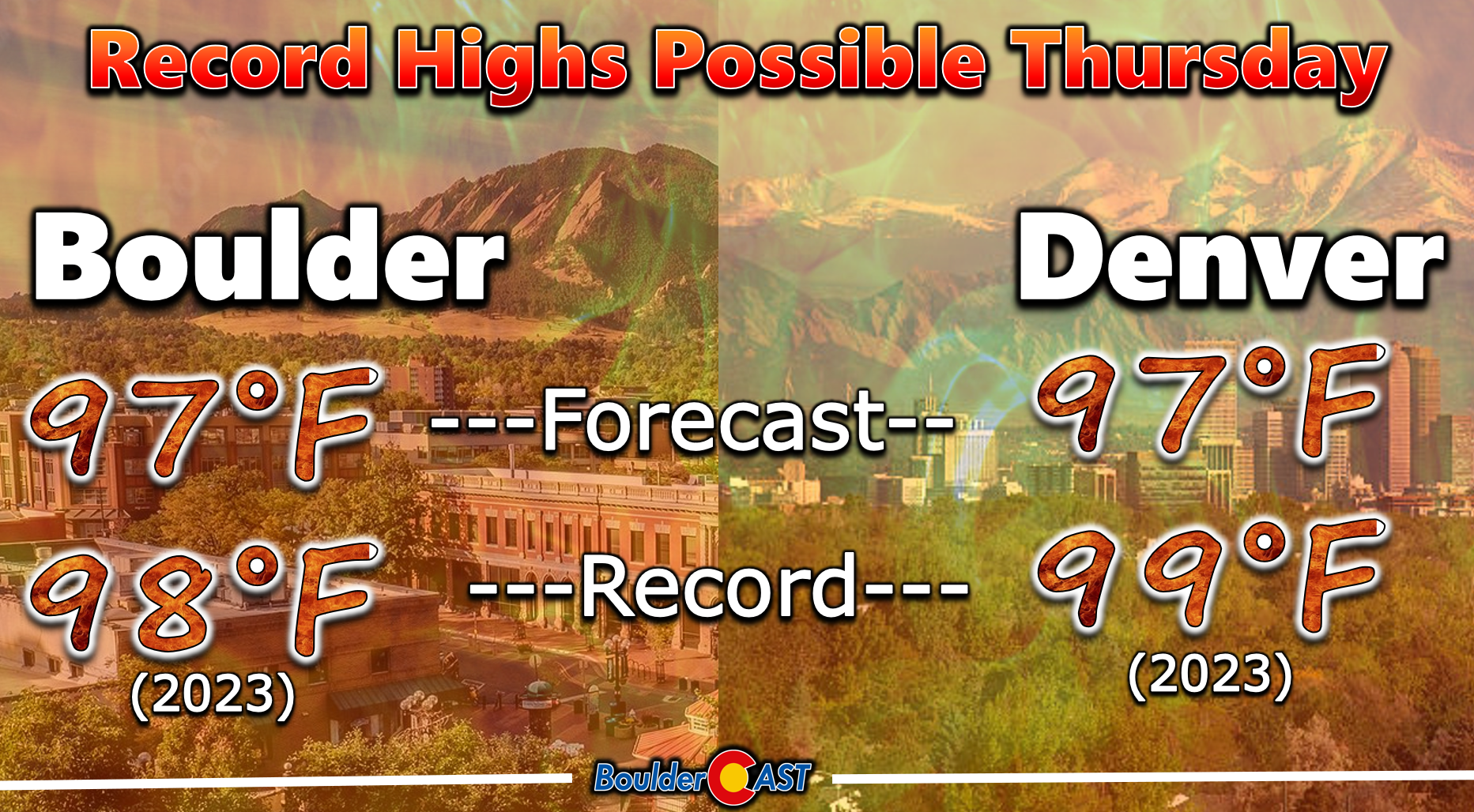 Boulder’s forecast high is right around 97°F, just shy of the August 21st record of 98°F set in 2023. Denver’s sitting in similar territory — aiming for 99°F, which also happens to be the record from that same hot summer day two years ago.