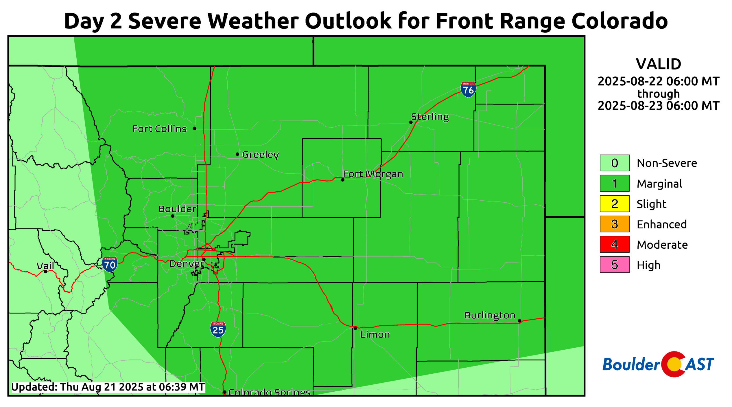 The Storm Prediction Center has northeast Colorado under a Marginal Risk for severe weather on Friday. Keep an eye to the sky!