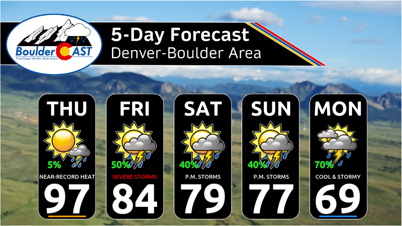 - Final Day of Intense Heat: Highs in the mid to upper 90s today, with Boulder and Denver flirting with record temperatures from 2023. A few spots may hit 100°F.