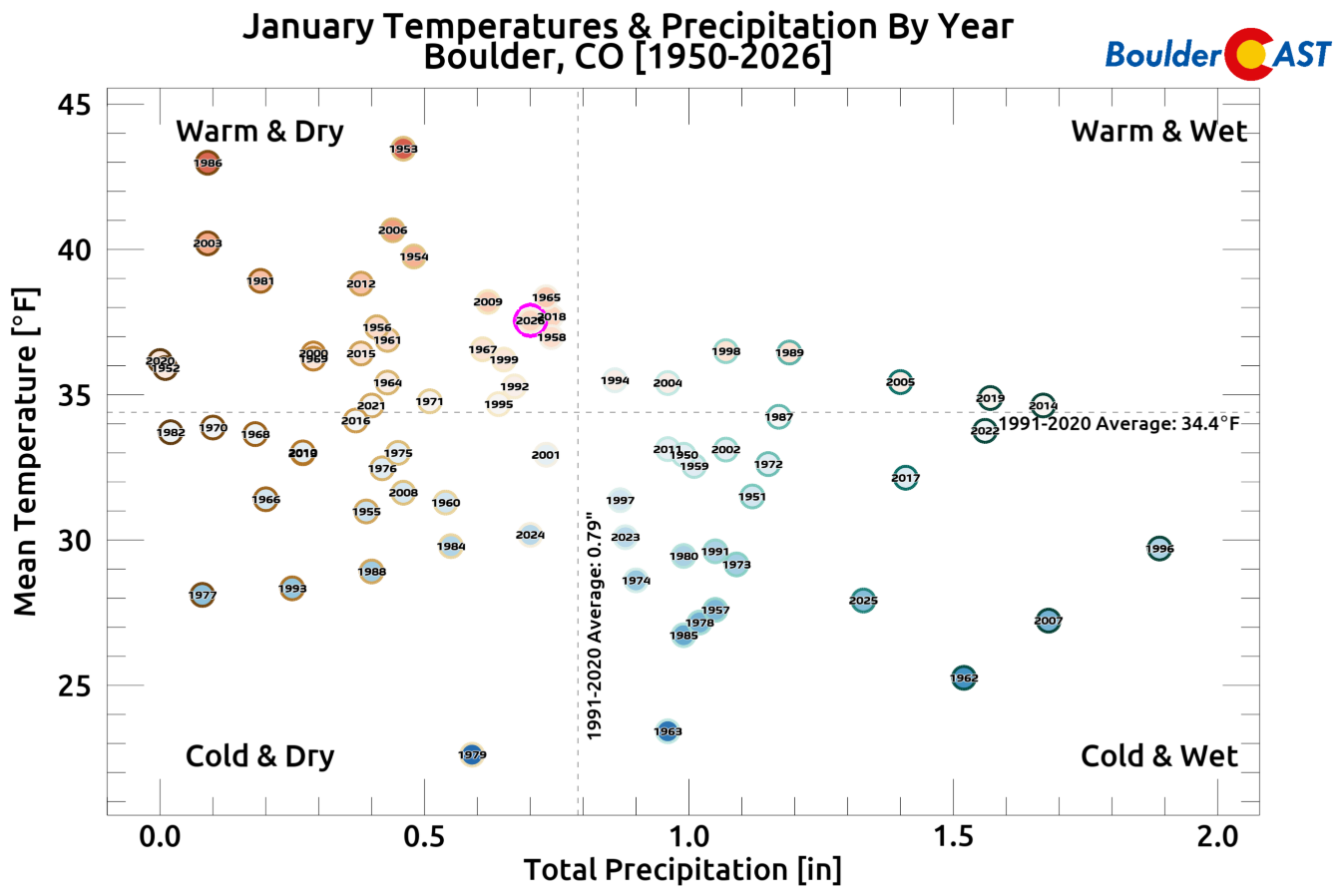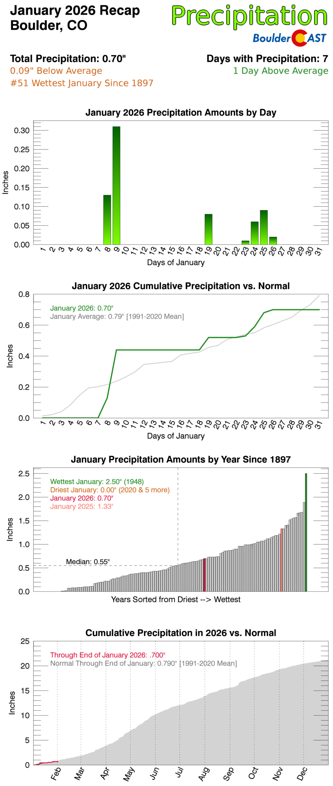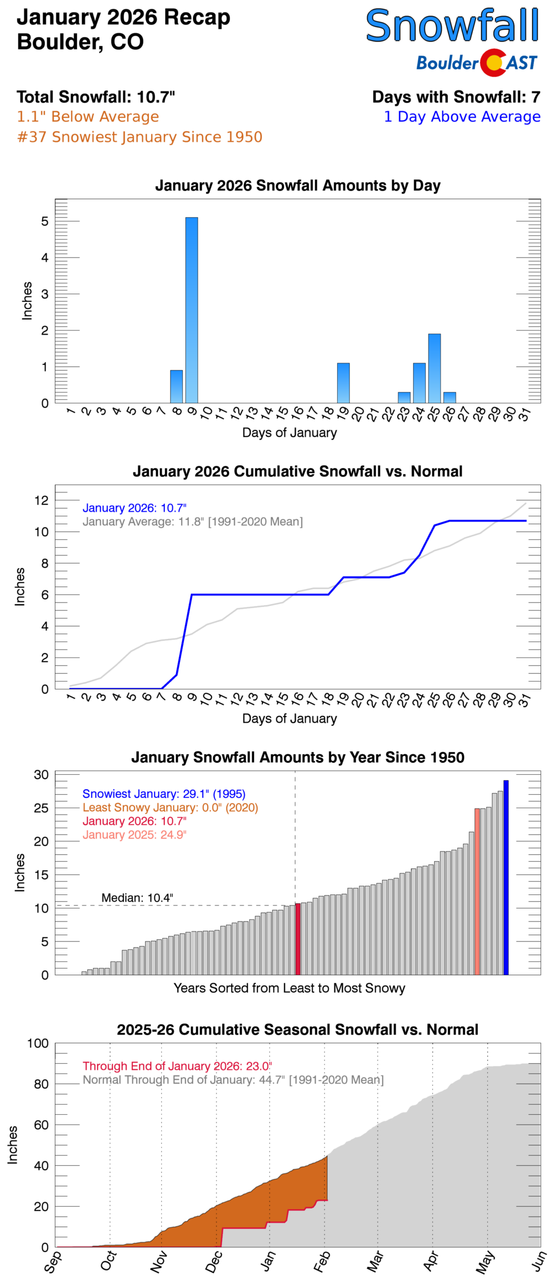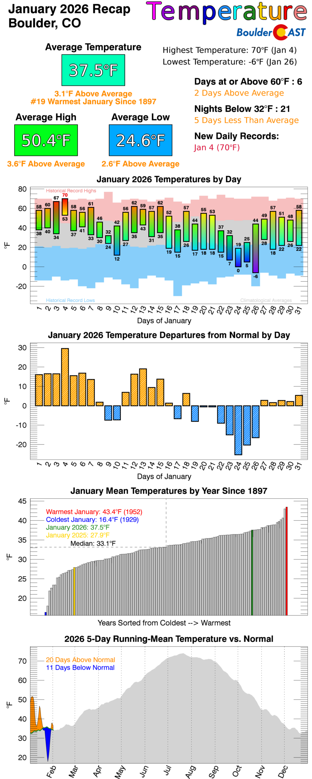 January 2026 wrapped up feeling more like an early taste of spring than the heart of winter along the Front Range, with warm spells, frequent downslope winds, and only fleeting brushes with snow. Boulder spent much of the month running well above normal, dodging storm after storm as the real winter weather stayed locked in the Mountains and across the eastern half of the country. Here’s a quick and colorful graphical recap of our weather during January and how it relates to climatology.