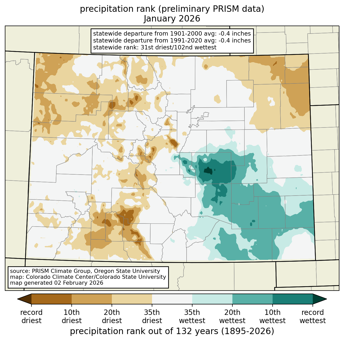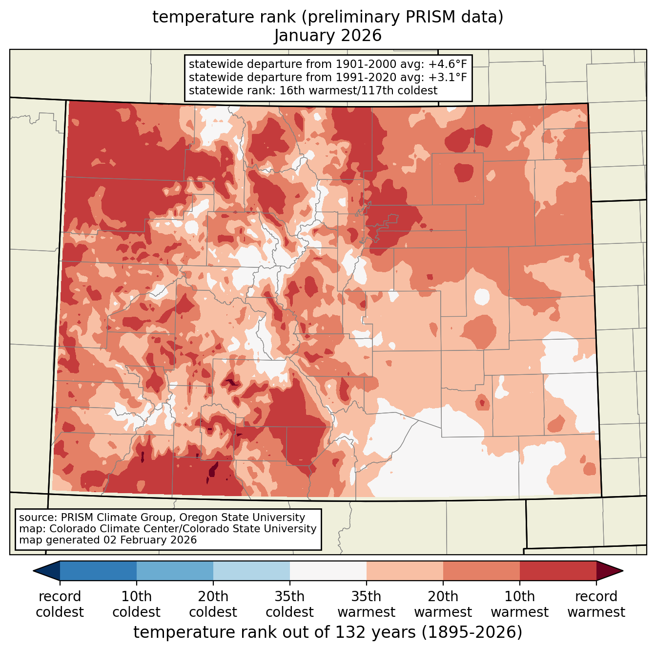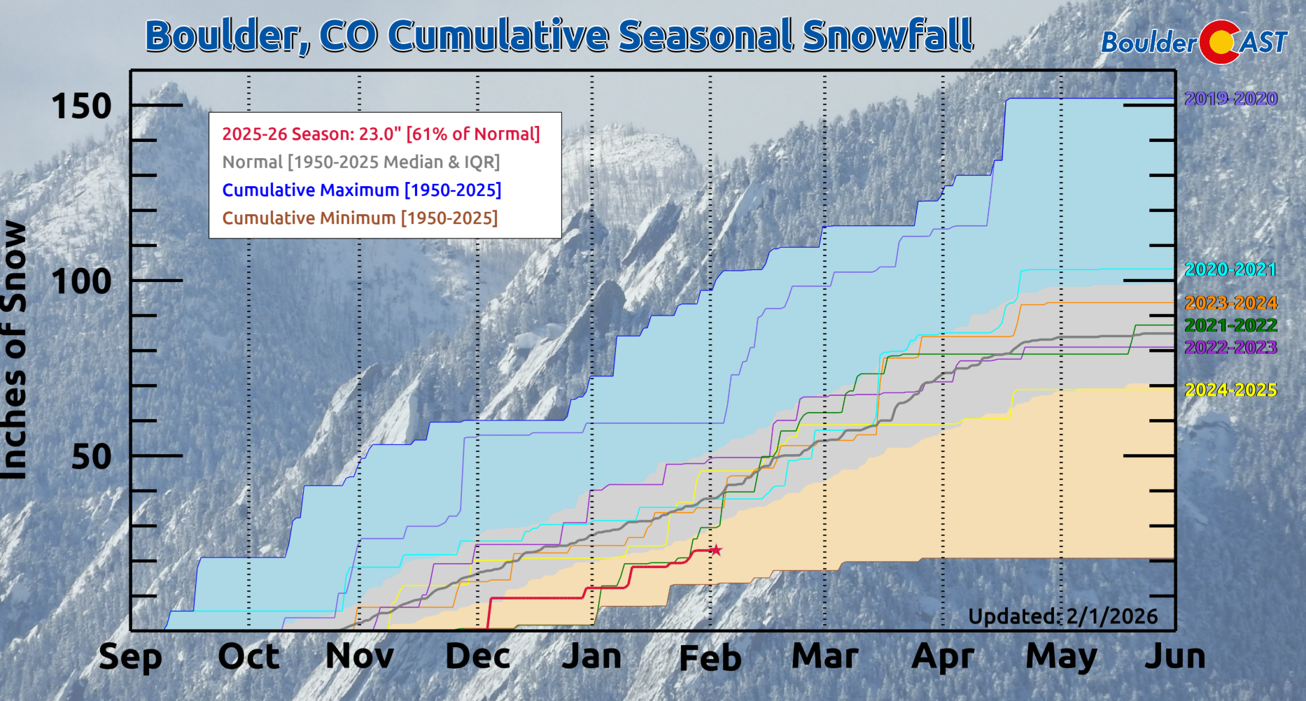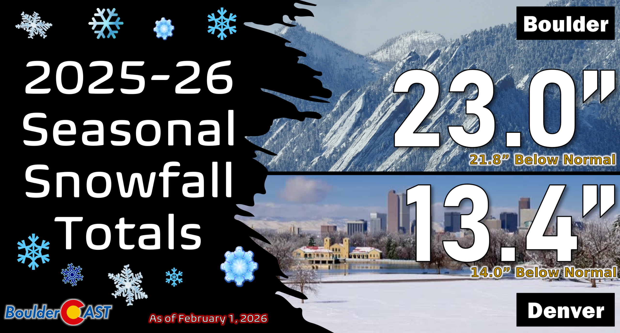 January 2026 wrapped up feeling more like an early taste of spring than the heart of winter along the Front Range, with warm spells, frequent downslope winds, and only fleeting brushes with snow. Boulder spent much of the month running well above normal, dodging storm after storm as the real winter weather stayed locked in the Mountains and across the eastern half of the country. Here’s a quick and colorful graphical recap of our weather during January and how it relates to climatology.