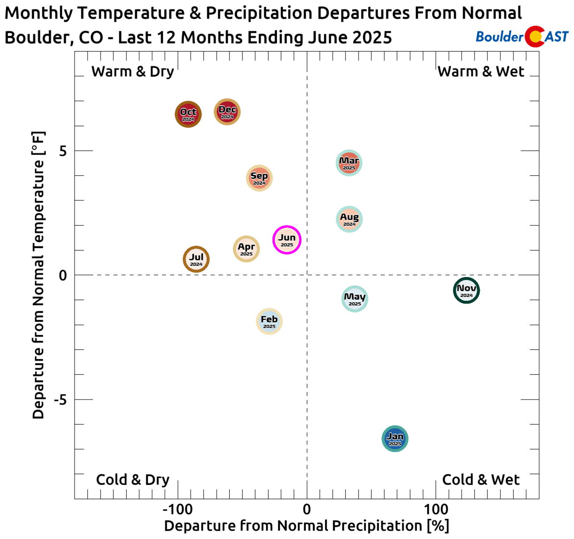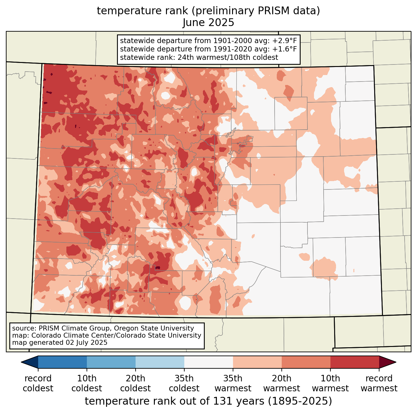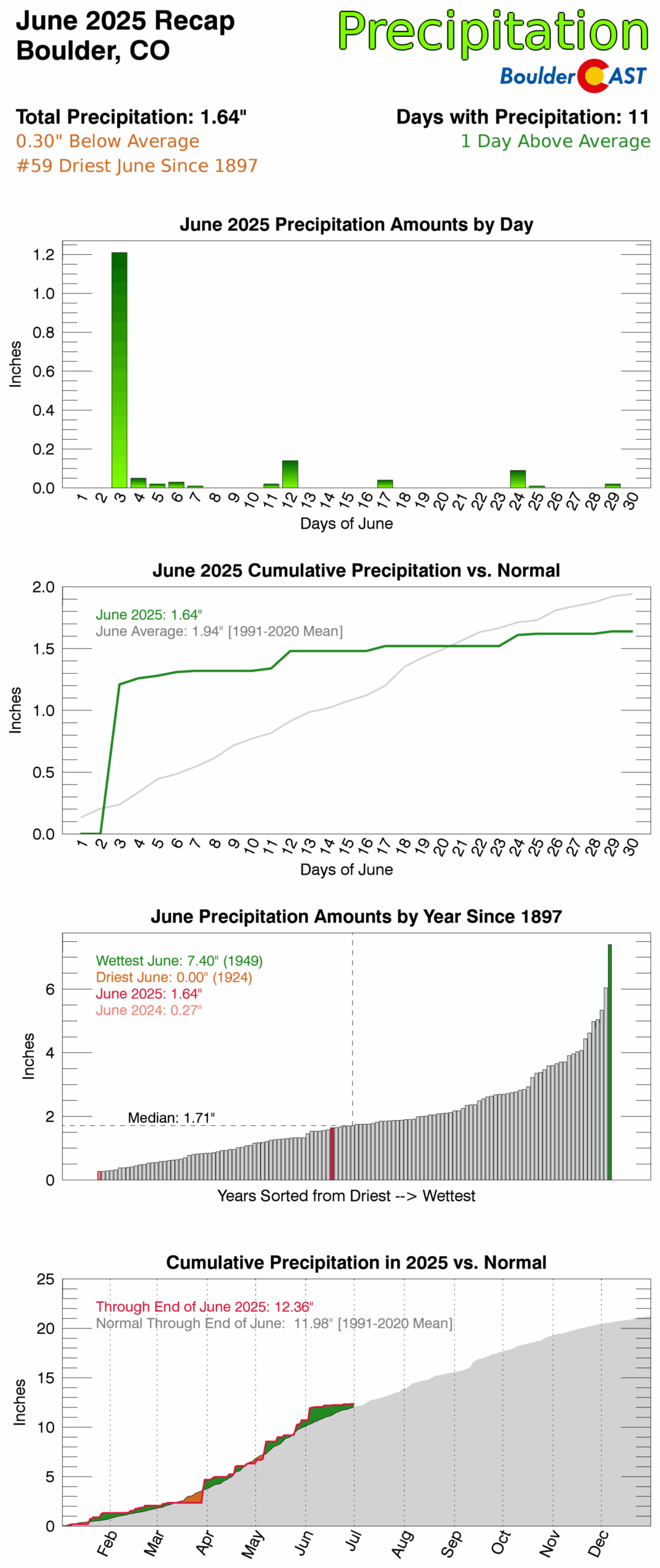 June 2025 started out cool and rainy in the Front Range, but precipitation became much more scarce as the month wore on, with our landscape drying out and fire danger creeping up over time. The month also featured several rounds of damaging severe weather and multiple sizzling heat waves. Here’s a quick and colorful graphical recap of our weather during June and how it relates to climatology.
