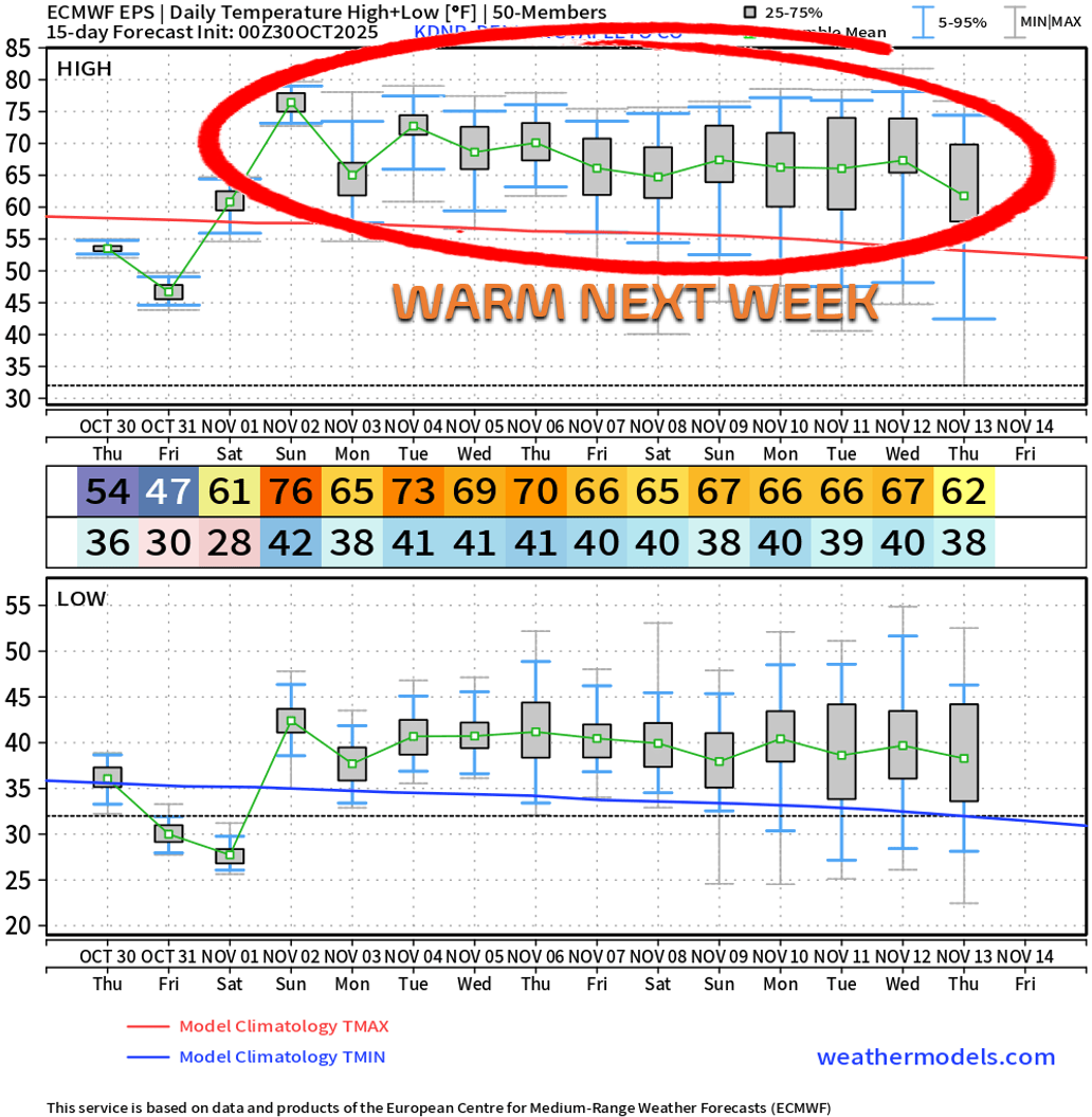 As the western ridge builds and holds across the southern Rockies, we’re likely to stay in a fairly warm pattern most of next week as well, with highs landing in the 60s to lower 70s deep into November.