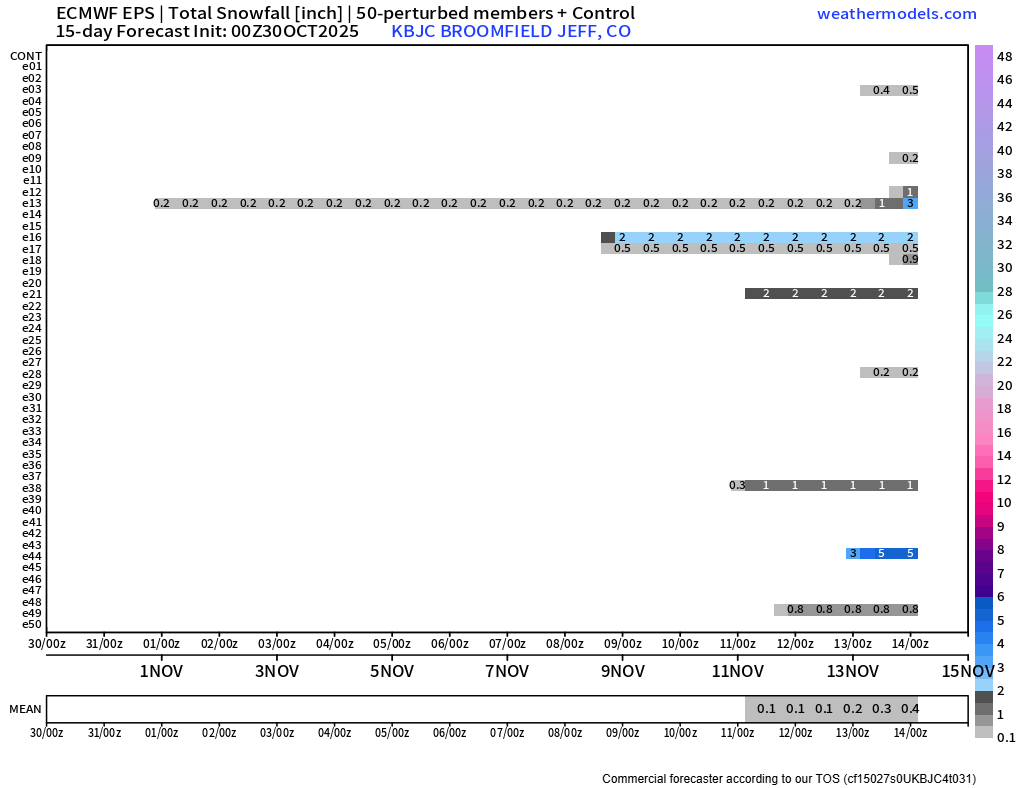 Furthermore, only 20% of European ensemble members show any snow through mid-November. That leaves us with an 80% chance of staying snow-free.