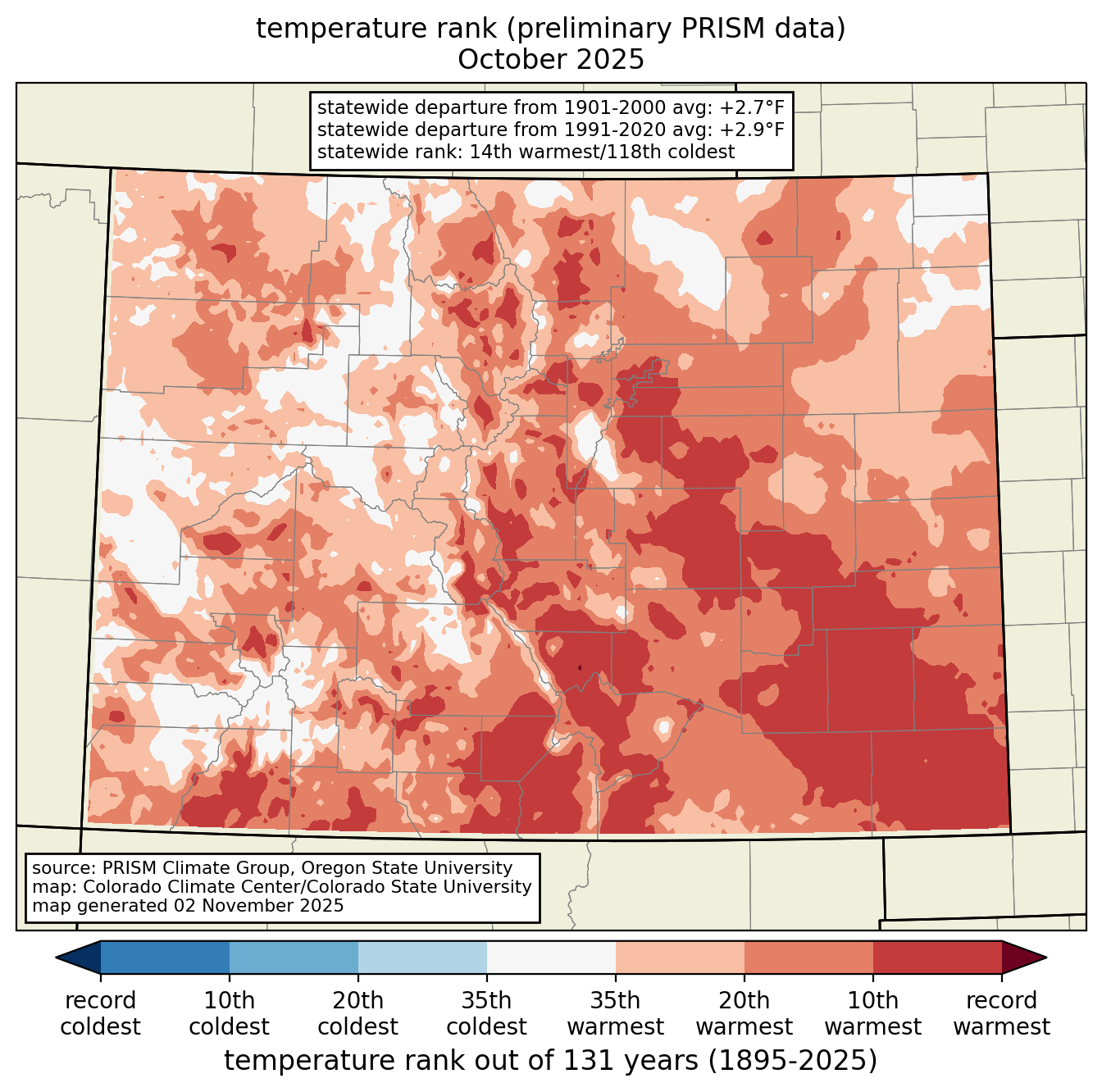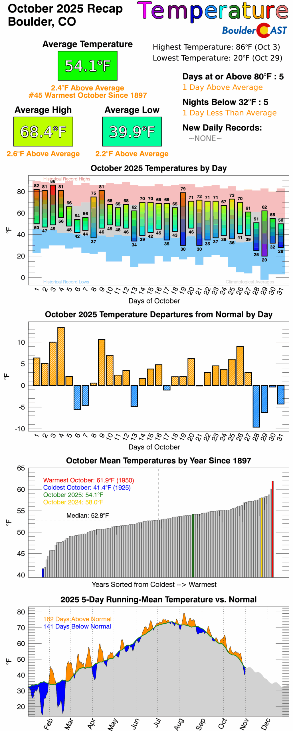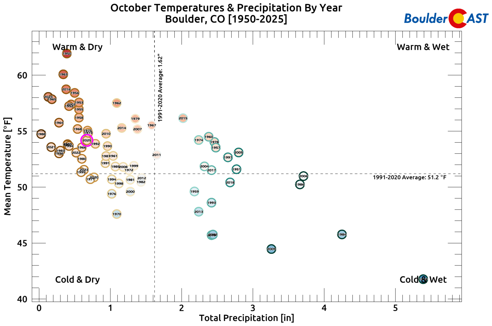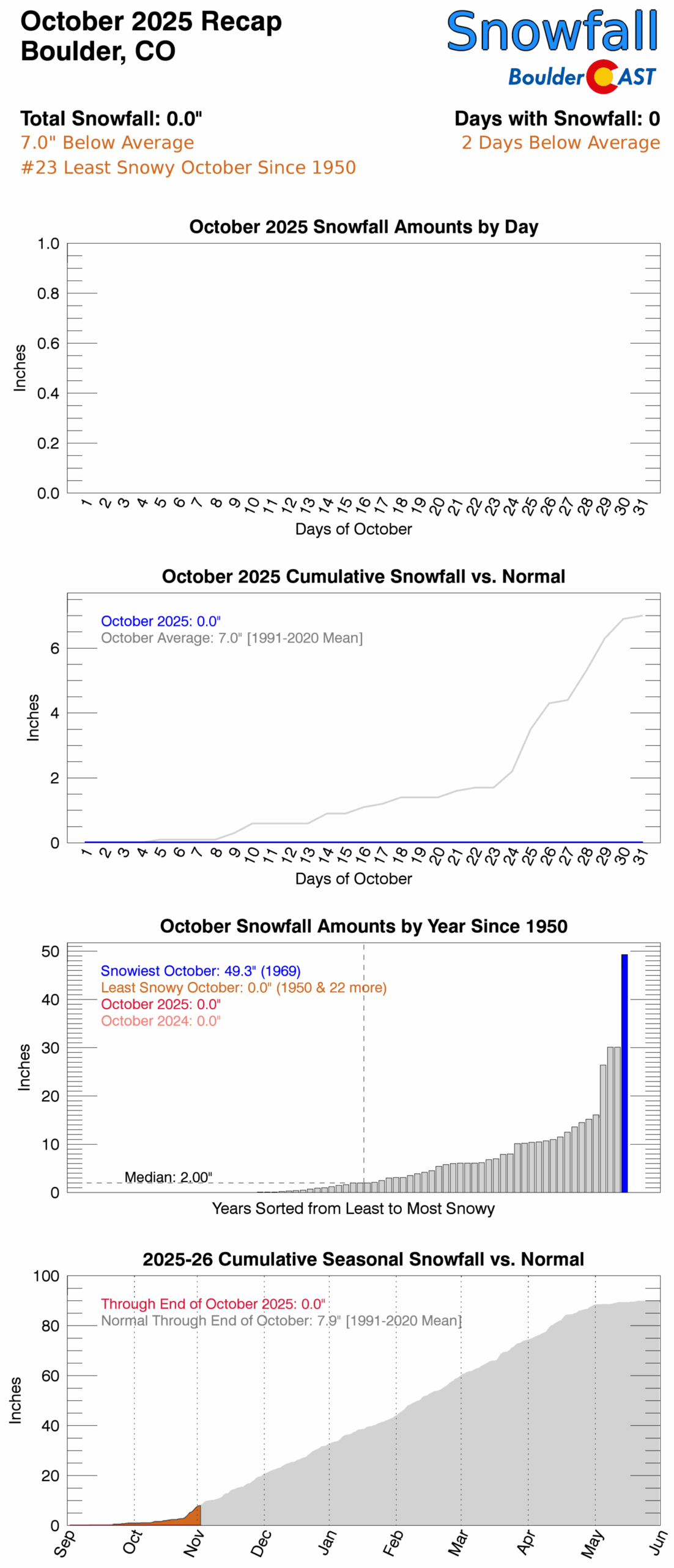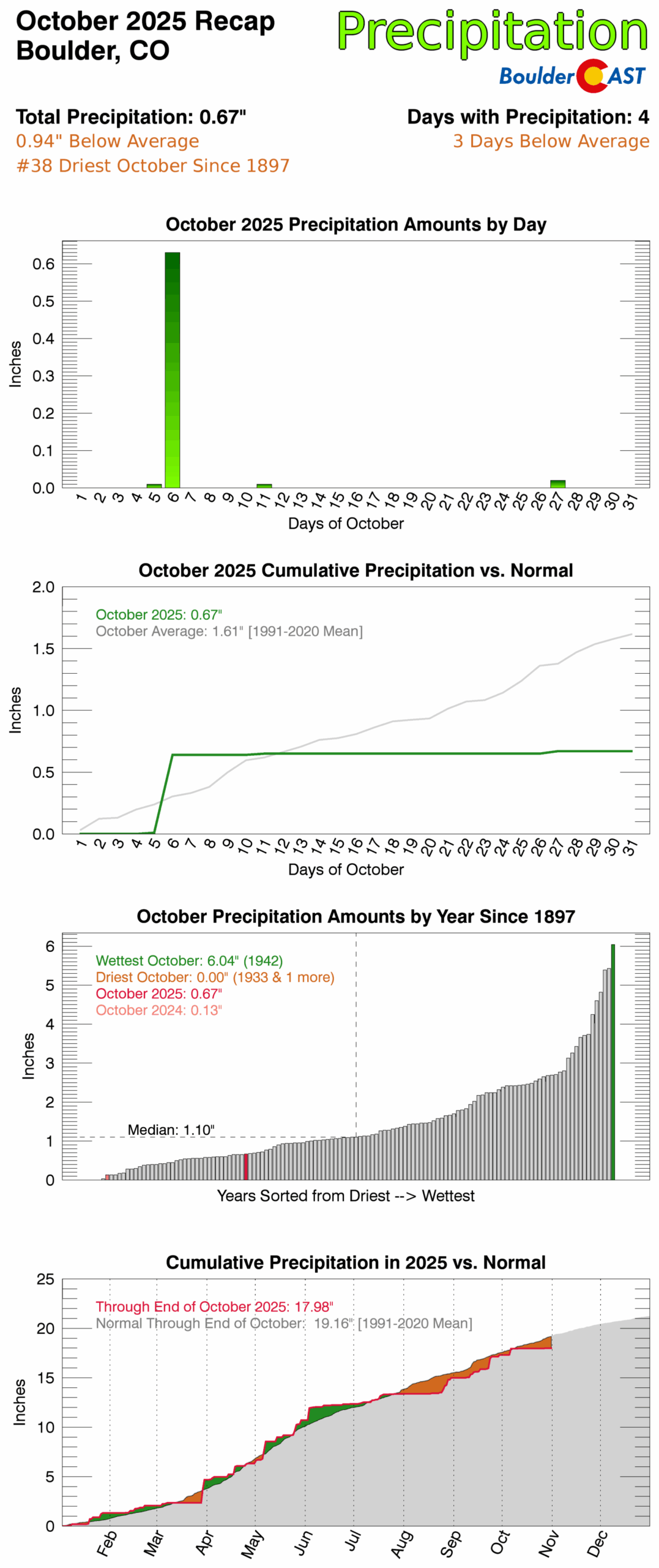 October 2025 was definitively warm and dry throughout the Front Range with the primary storm track remaining well north across Wyoming and Montana. The only real precipitation event during the month occurred on October 6th with some locations picking up more than one half inch of rain. Our first frost of the season occurred about two weeks later than normal, and to this day we’re still waiting for those magical first snowflakes across the lower elevations. Here’s a quick and colorful graphical recap of our weather during October and how it relates to climatology.