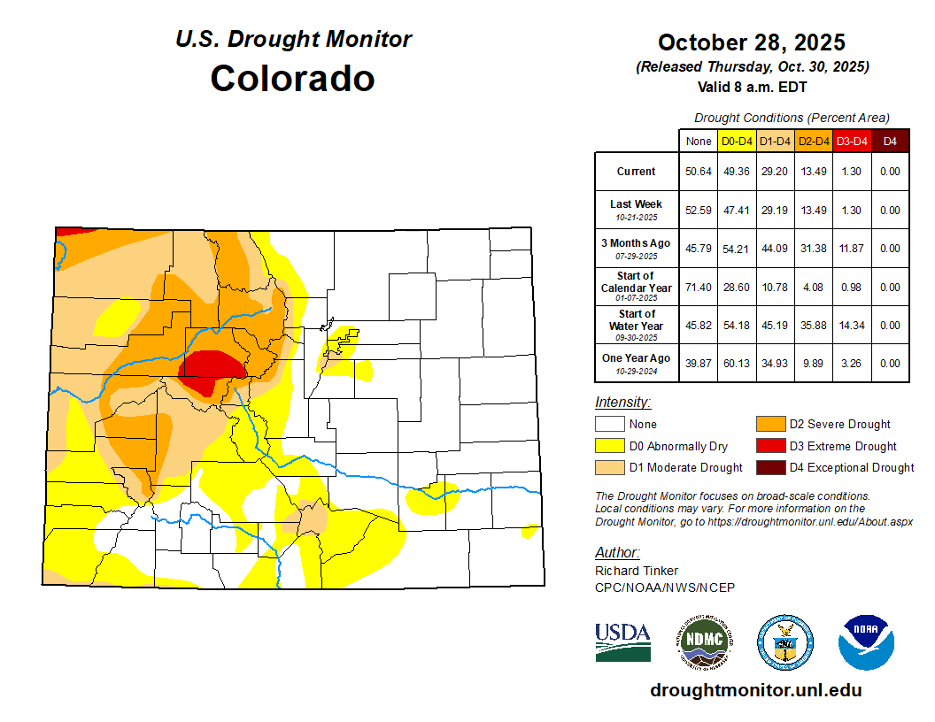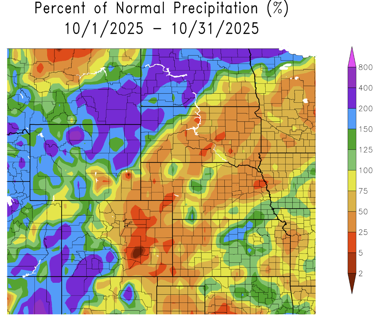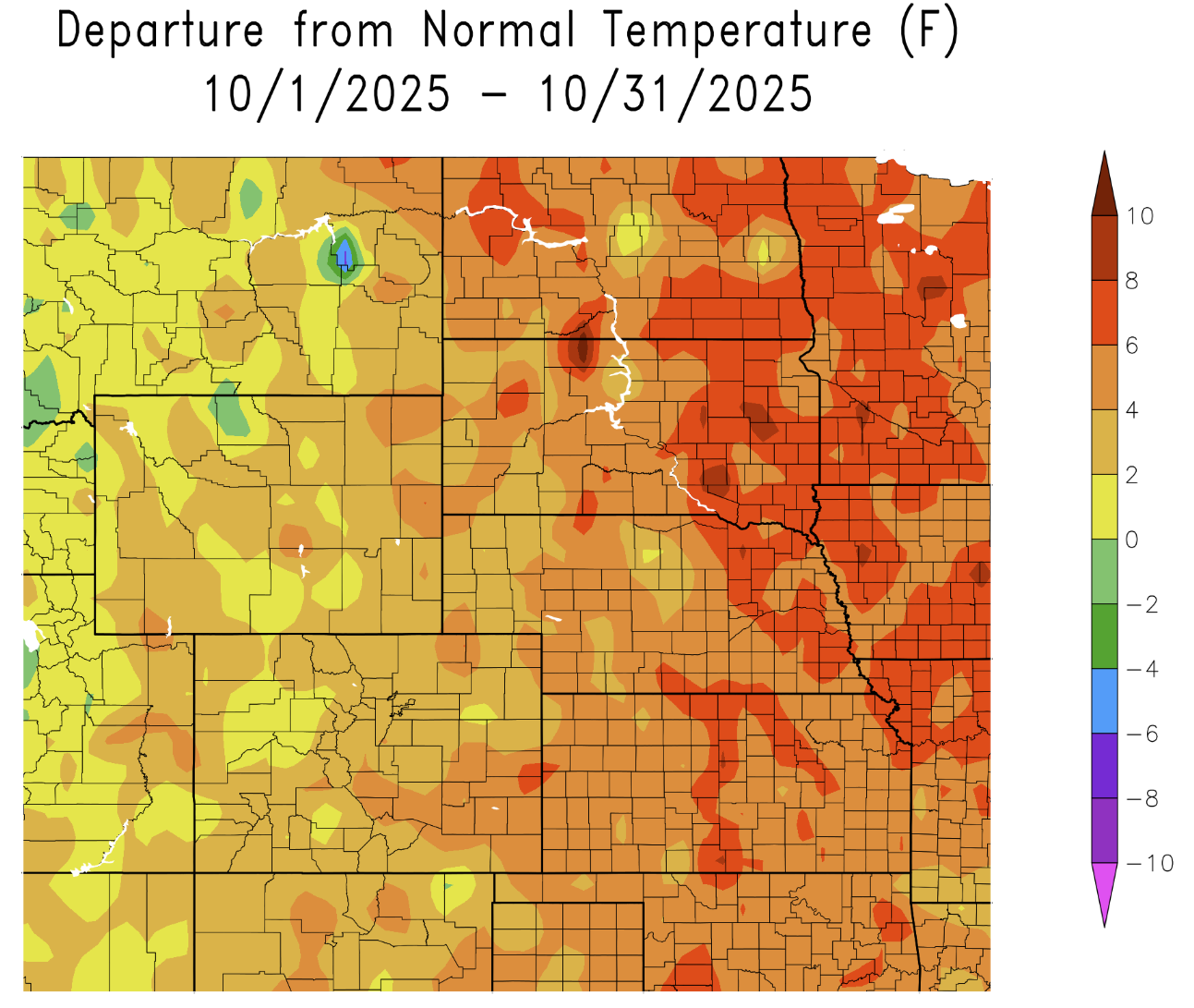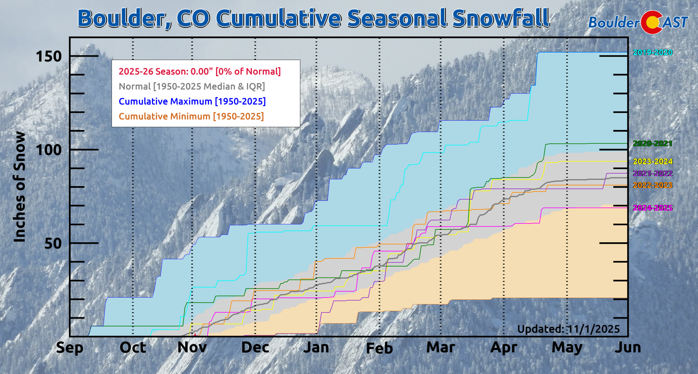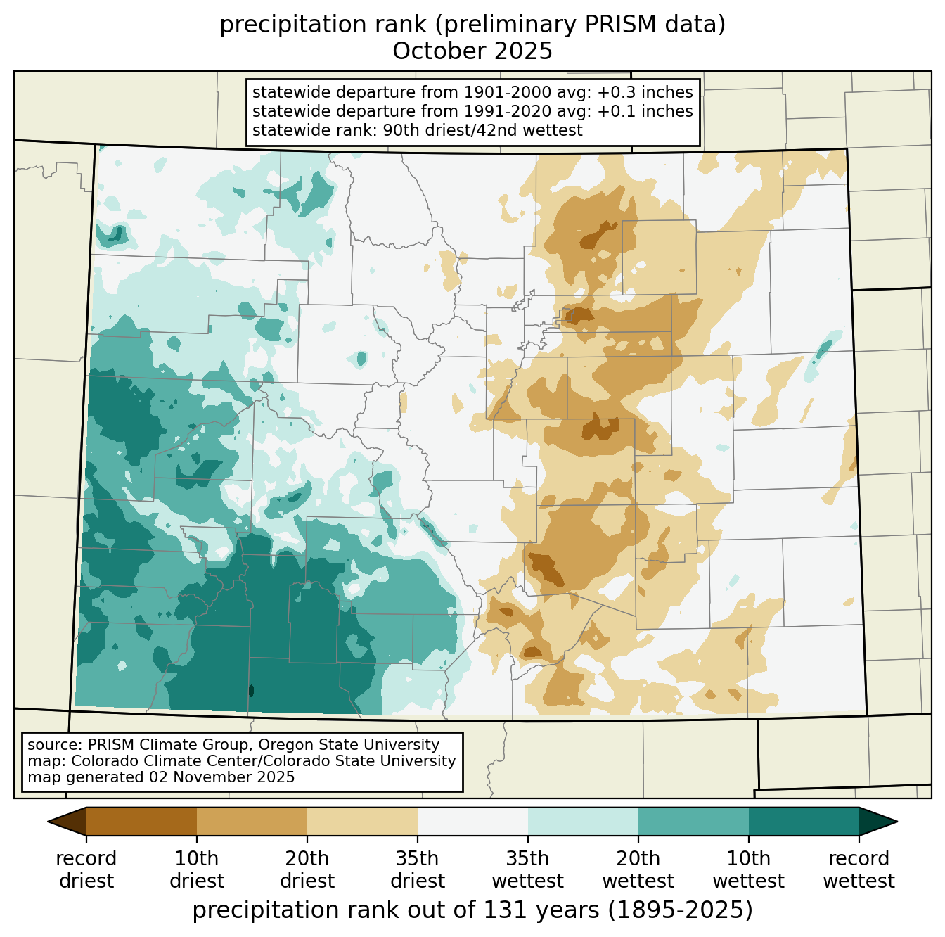 October 2025 was definitively warm and dry throughout the Front Range with the primary storm track remaining well north across Wyoming and Montana. The only real precipitation event during the month occurred on October 6th with some locations picking up more than one half inch of rain. Our first frost of the season occurred about two weeks later than normal, and to this day we’re still waiting for those magical first snowflakes across the lower elevations. Here’s a quick and colorful graphical recap of our weather during October and how it relates to climatology.