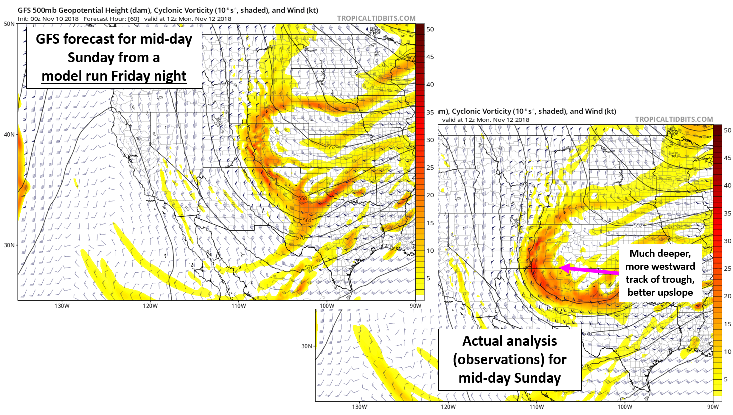 Unlike the quick-moving open-wave disturbance indicated in forecasts the day before (below on left), the storm actually came in much stronger, further west, and nearly cut-off at 500 mb (below on right). This structure put the Front Range in a much more developed upslope regime for an extended period of time.