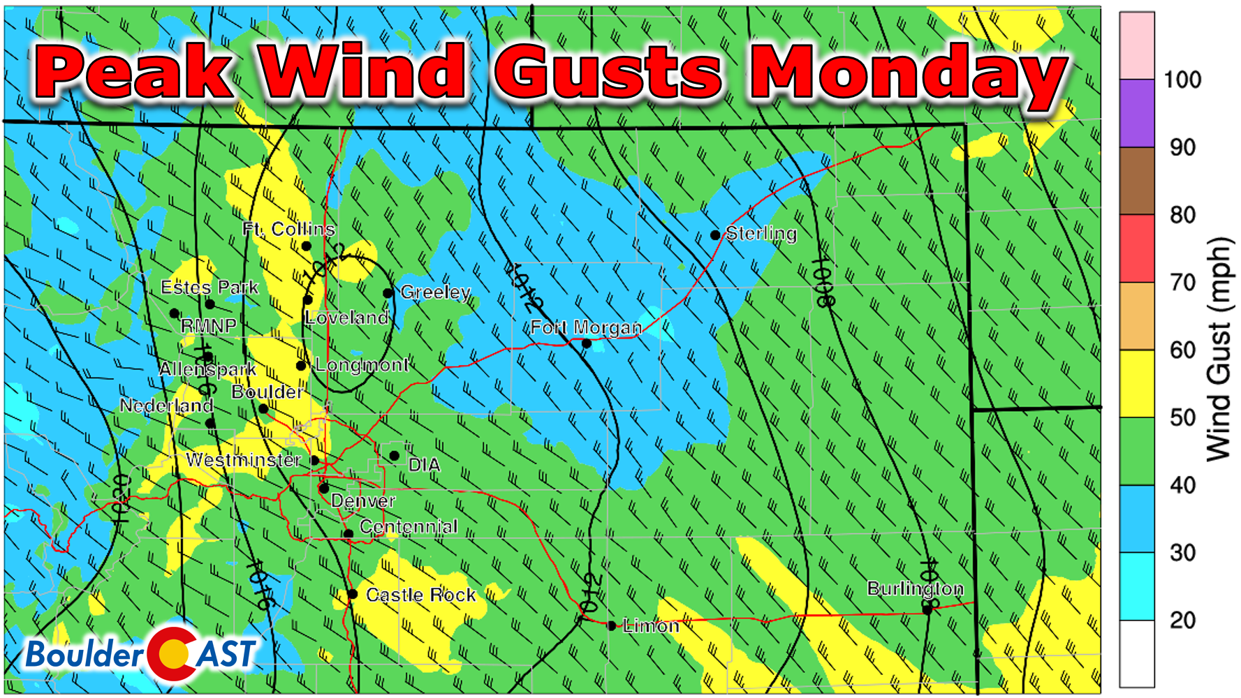 Westerly winds will quickly ramp up Monday morning with widespread gusts of 40 to 60 MPH expected across much of eastern Colorado today. While the latest model runs have indeed weakened the forecasted winds somewhat, fire danger will definitely be elevated through the day. We review the latest model data and provide an update on how the high winds, Mountain snow, and fire risk will unfold on Monday.