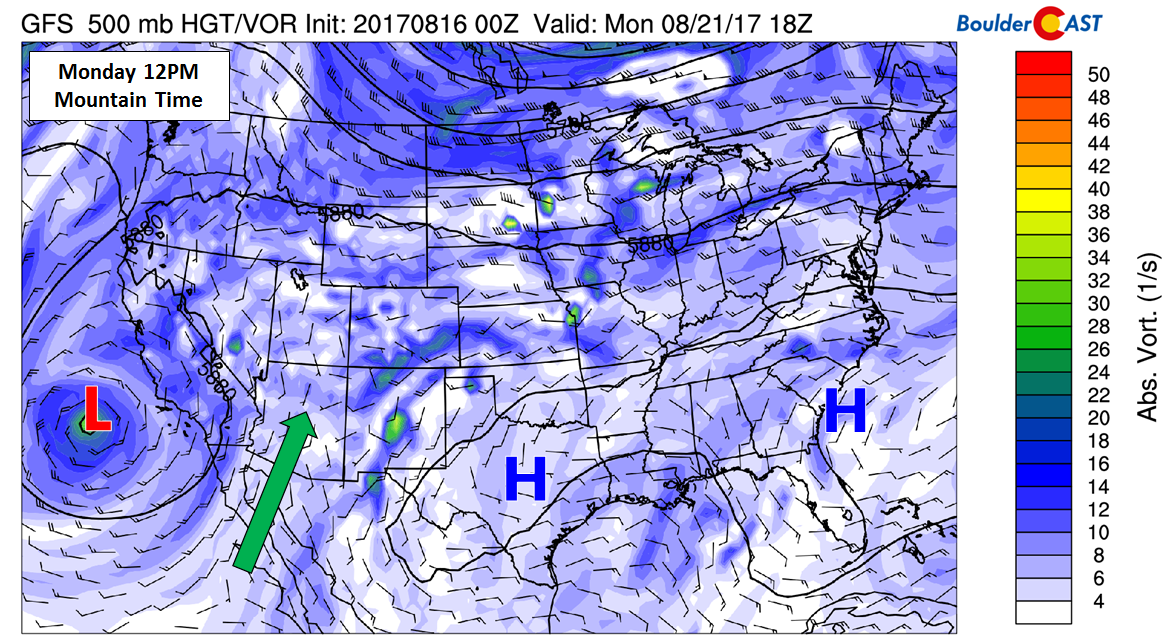Our main concern with the flow on Monday will be the monsoon, which will be located to our south across Arizona, which is slated to potentially bring in a few afternoon thunderstorms to the High Country. Most of these storms should not develop over the Plains until later after the eclipse though. We’re also watching an area of low pressure and frontal boundary across Nebraska and a weak system over northern Wyoming. We will provide updates to the forecast over the weekend.