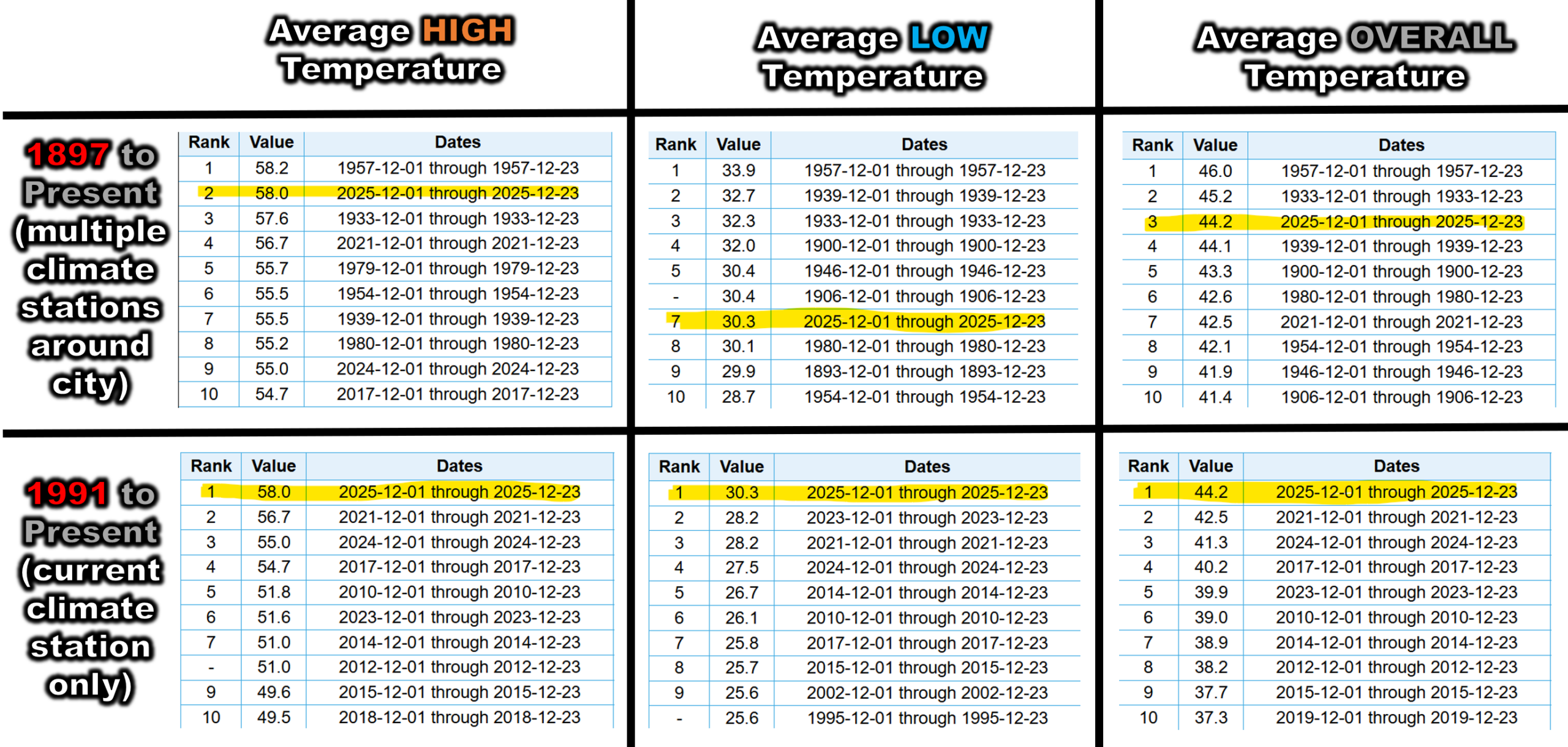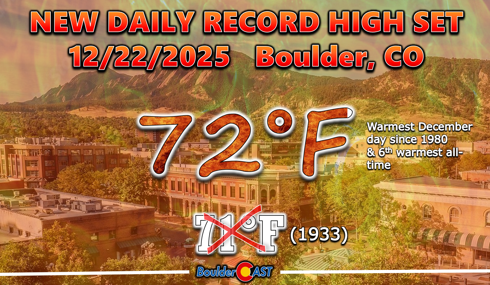 For Boulder, month-to-date this December has been the warmest for overall average temperature, average high temperature and average low temperature since the current climate station near NIST in south Boulder was established in ~1990. When considering all data across multiple observation sites in the city dating back to the late 1800s, December 2025 so far ranks in the Top 7 for each category as well — it truly has been exceptional warmth on all fronts this month.