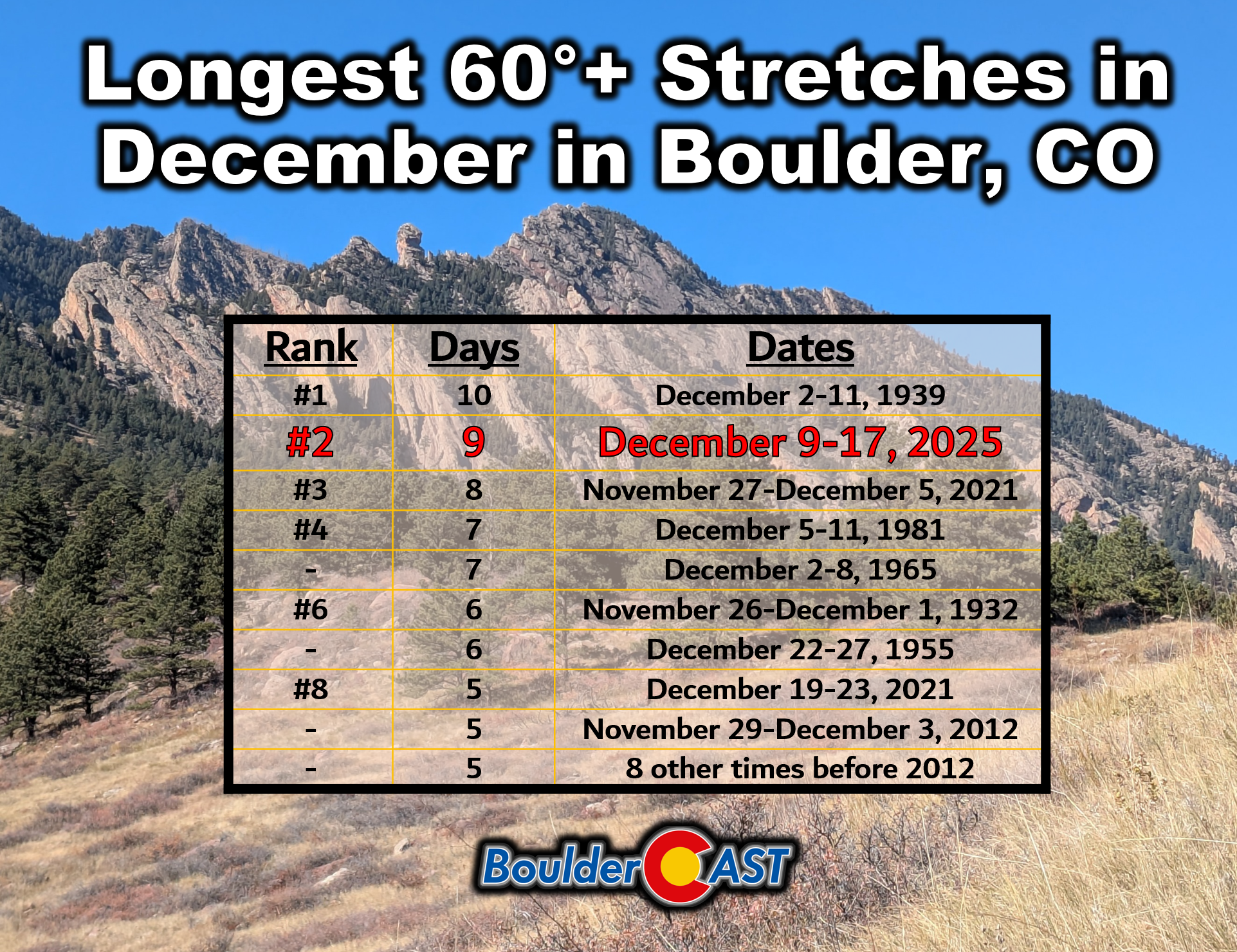 We nearly pulled off an unprecedented streak of 60°+ days in December. Cloud cover on one afternoon kept us “only” at 58°, breaking the run at nine days. Without that hiccup, we’d be sitting at 16 straight days above 60° right now, standing well ahead of any prior streak in Boulder’s historical record.