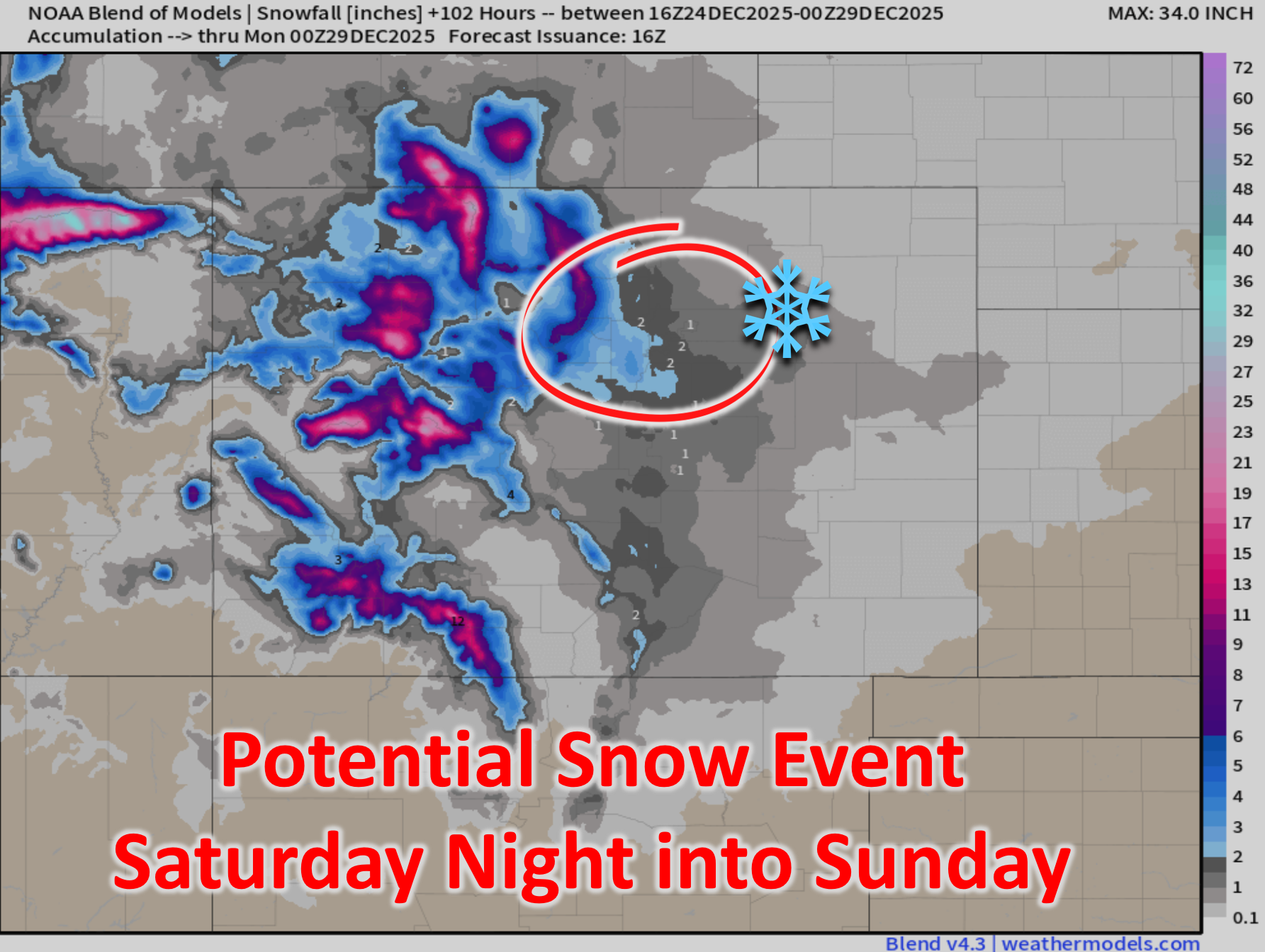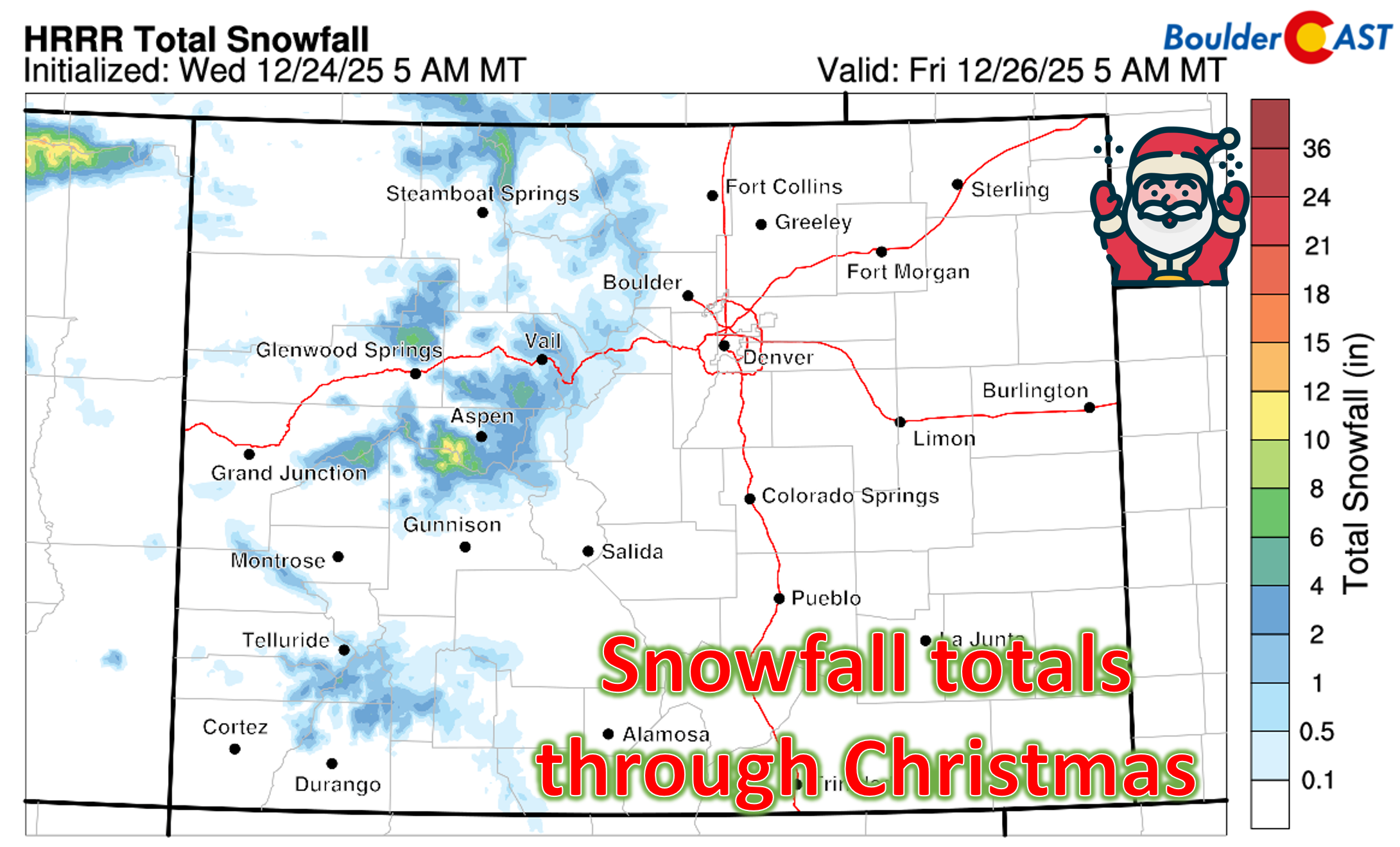 There will be some snow falling tonight and on Christmas Day in the Mountains as moist southwest flow arrives from the Pacific, but it won’t be much. Nearby mountain ranges can expect just a dusting to 2″ of new accumulation for the holiday, mainly on the highest peaks with southwest exposure. Only the most minor travel disruption is anticipated on local travel corridors like Eisenhower Tunnel, Vail Pass, Loveland Pass or Berthoud Pass. A bit more snow is in the works for the mountains near Aspen and Steamboat (3 to 6 inches). Lower elevations of the mountain valleys west of the Divide will be too warm and should prep their umbrellas for sporadic raindrops on Christmas Day.