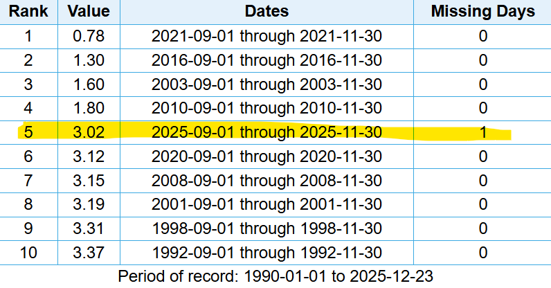 Even before that snow, it had been pretty dry in the months prior. It was the 5th driest meteorological autumn (Sep 1st – Nov 30th) since 1990 in Boulder, though we must note it has not been nearly as dry as Fall 2021 in the lead up to the Marshall Fire.
