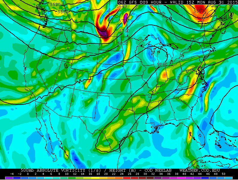 The GFS 500 mb map above shows the current weather set-up as of 11am Monday. There is a weak trough across much of the East, and for Colorado, not much going on. A bulk of the action associated with the jet stream will continue to remain to our north, near the Canadian border, through the week. However, if you are observant, you may have noticed that flow across Colorado is nearly southwesterly. This flow will strengthen through the week, bringing a slight revival to the monsoon!